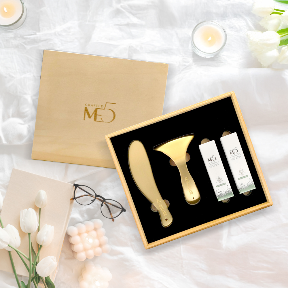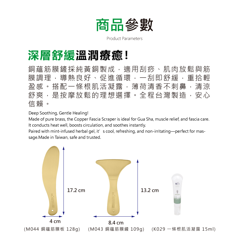 開啟專屬你的日常刮痧儀式ME5銅蘊刮痧套組,結合純黃銅工藝與實用按摩板型設計,能針對肩頸痠痛、背部疲勞、腿部緊繃進行全方位呵護。搭配一條根肌活凝露舒緩肌膚,讓每一次刮痧都更加溫和舒適。木盒精緻典藏,送禮自用兩相宜,傳遞深層放鬆與養生儀式感。