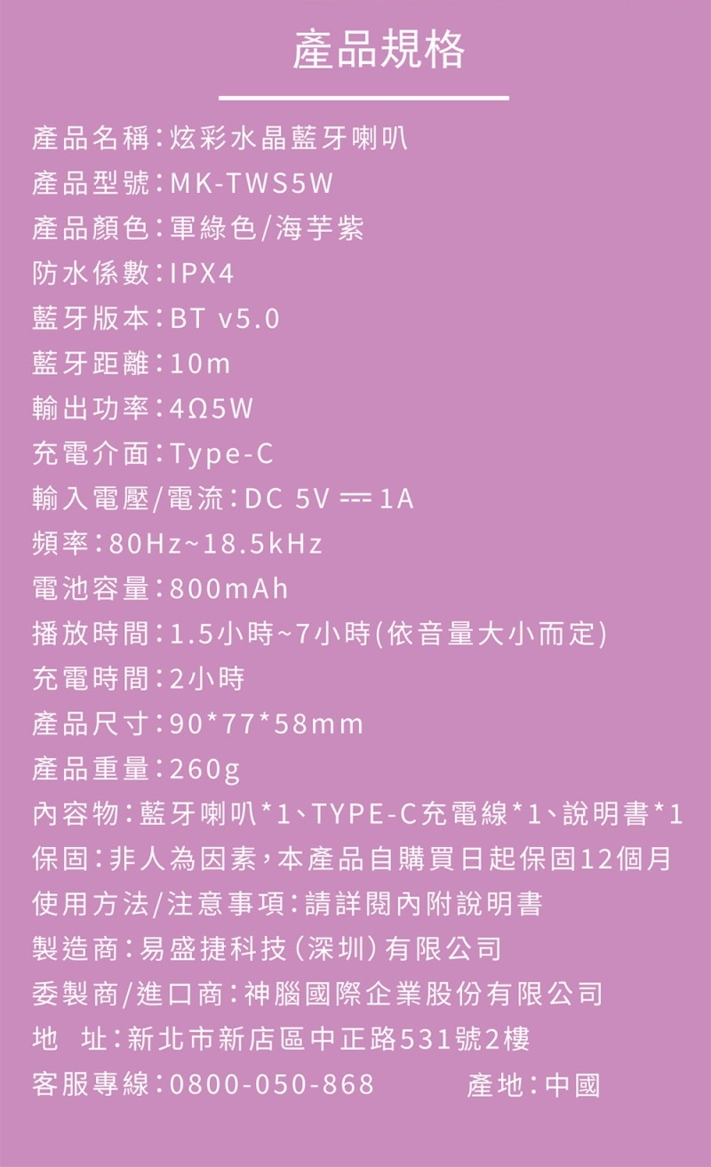 內容物:藍牙喇叭*1、TYPE-C充電線*1,1說明書*1