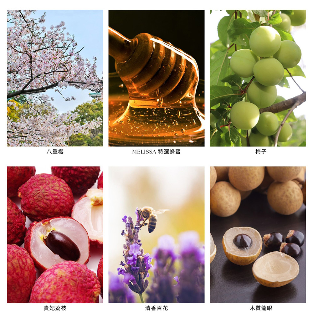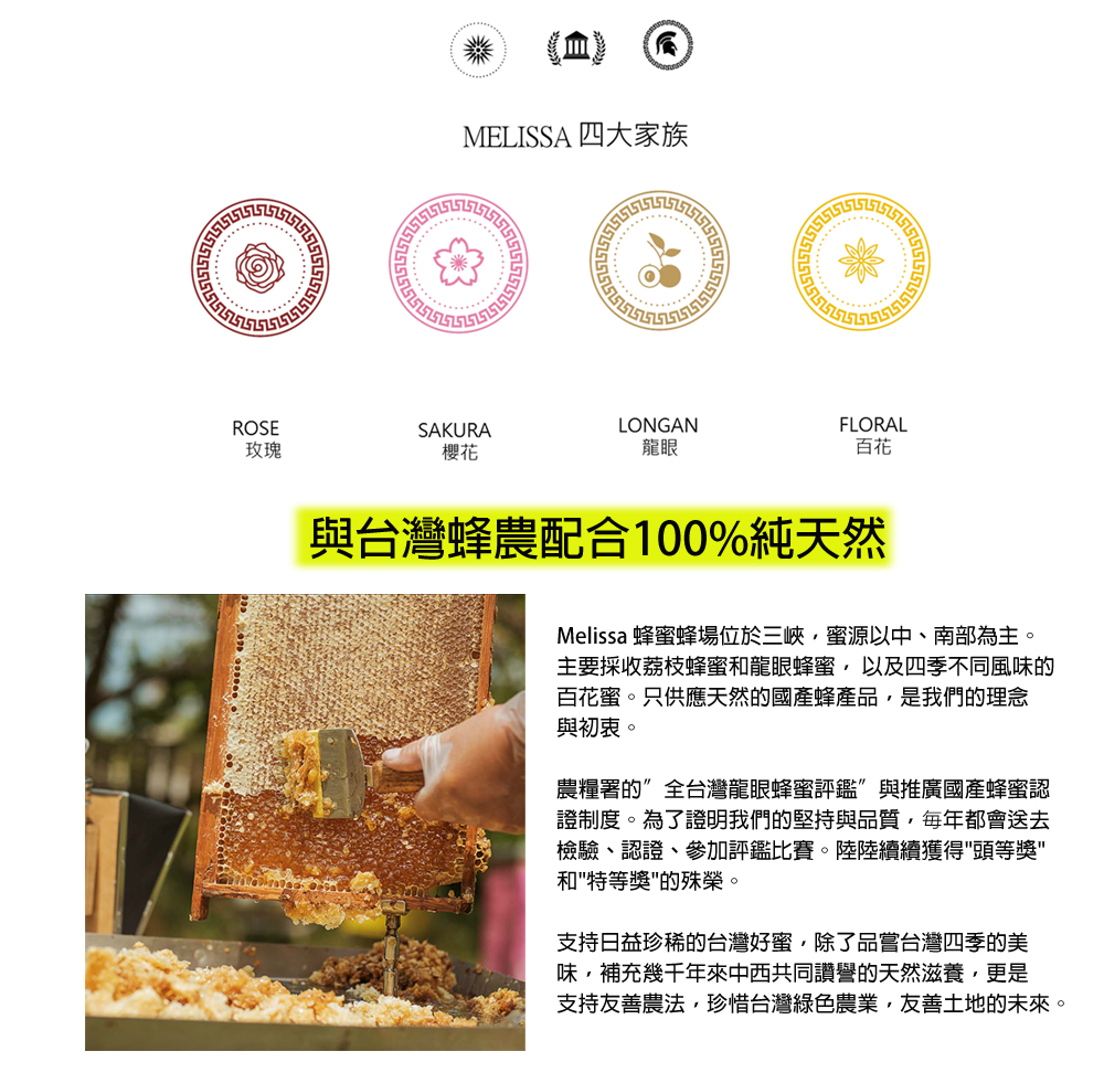 【Melissa】玫瑰420g+龍眼420g 2入蜂蜜禮盒組盒(贈送蜂蜜氣泡飲6入)市價699MELISSA精品蜂蜜禮盒在高級的皮革紋路精裝盒上鋼印 MELISSA Logo以玫瑰金點綴散發象徵古希臘的優雅以及奢華完美詮釋MELISSA的高品質和講究-MELISSA蜂蜜 - 含皇后玫瑰花瓣以木質龍眼蜜為基底,結合花之皇后 – 可食用頂級大紅玫瑰花瓣在花香最濃郁的時候採收,並以最新科技殺菌處理,保留如同鮮採的絲絨花色以及每朵花魂最完整的香氣嚴選花青素最高的屏東有機皇后玫瑰天然的鮮紅色花辮富含多種維生素、花青素及玫瑰多酚玫瑰花蜂蜜的味道清香幽雅, 濃郁的花香以及蜂蜜的清甜完美融合在花香最濃郁的時候採收,並以最新科技殺菌處理,保留如同鮮採的絲絨花色以及每朵花魂最完整的香氣全世界最高花青素的皇后玫瑰蜂蜜 數量稀少且珍貴 MELISSA蜂蜜 - 含龍眼龍眼蜜並非台灣獨有,但只有身為水果王國的台灣本產“龍眼蜜”,才能擁有最濃郁深邃的木質風味。每年只有一期的龍眼花季裡,蜂農與蜜蜂必須在台灣的“蜜源秘境”穿梭數百萬哩,才能得到滴滴珍貴的Melissa龍眼花蜜有別於一般的市售蜂蜜, MELISSA的蜂場有著輝煌的蜂蜜得獎紀錄, 而頭等獎已成為每年必拿得獎項堅持所有蜂蜜以最天然的方式脫水, 外勤蜂將花蜜採回放入巢房後,內勤蜂會不斷地來回吐出再吸入,如此增加蜜滴表面積,並且不斷增加搧風工作,促進蒸發降低水分琥珀色的清透色澤以及濃稠度有別於市售的糖水添加蜜濃郁的龍眼花香配上尾韻的深邃木質香MELISSA蜂蜜氣泡飲,就像是夏日午後的一絲微風,清新而迷人 結合了三種蜂蜜的甜美與香氣,氣泡飲料的清爽,口感細膩滑, 仿佛在口中綻放出一片天然的甜蜜的花園,每一口都彷彿是大自然的悄悄私語,讓人不禁陶醉其中。其淡雅的蜜香在舌頭上翩翩起舞,帶來一種身臨其境感受,讓人彷彿置身於一片田園的懷抱中,享受著大自然的恩賜。前段百花清爽的香氣|中段荔枝蜜果香|尾韻龍眼蜜獨特的木質調
