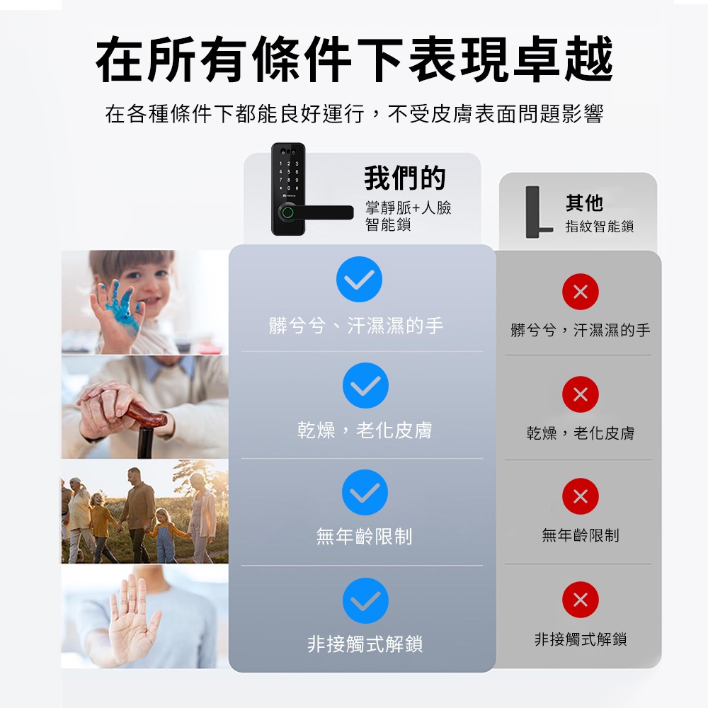🔹7種開鎖方式(掌靜脈/人臉/指紋/密碼/IC卡/鑰匙/APP)