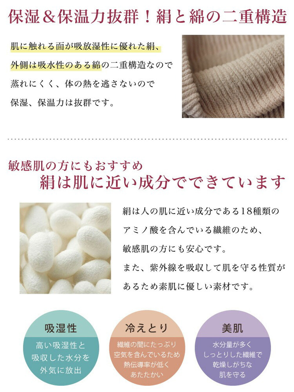 內層蠶絲材質富含天然蛋白質,成分與人體肌膚相近✔ 親膚安全✔ 吸濕、排汗、釋濕效果優異