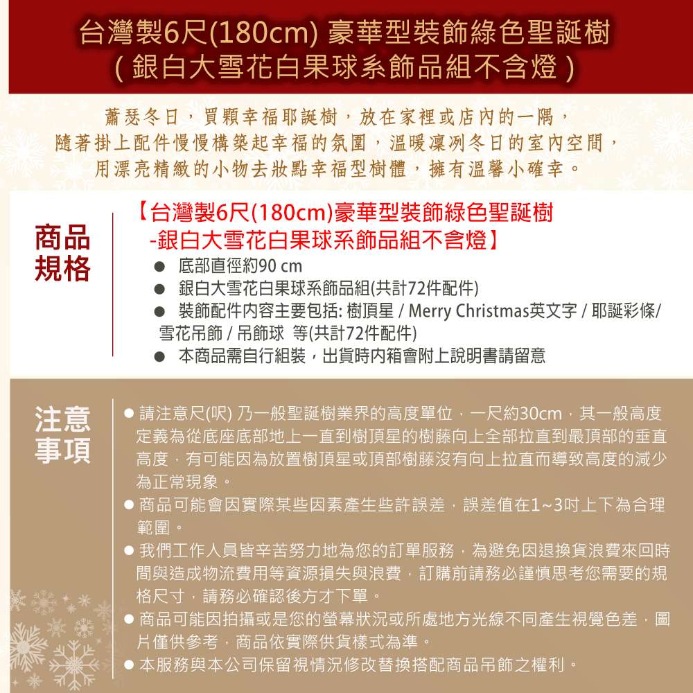 摩達客-台灣製6尺/6呎(180cm)豪華型裝飾綠色聖誕樹/銀白大雪花白果球系全套飾品組不含燈/本島免運費