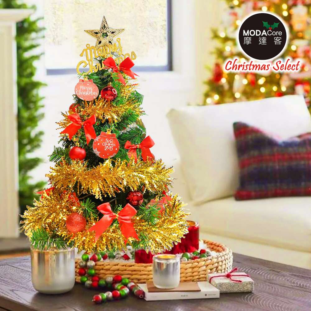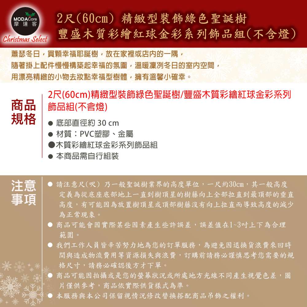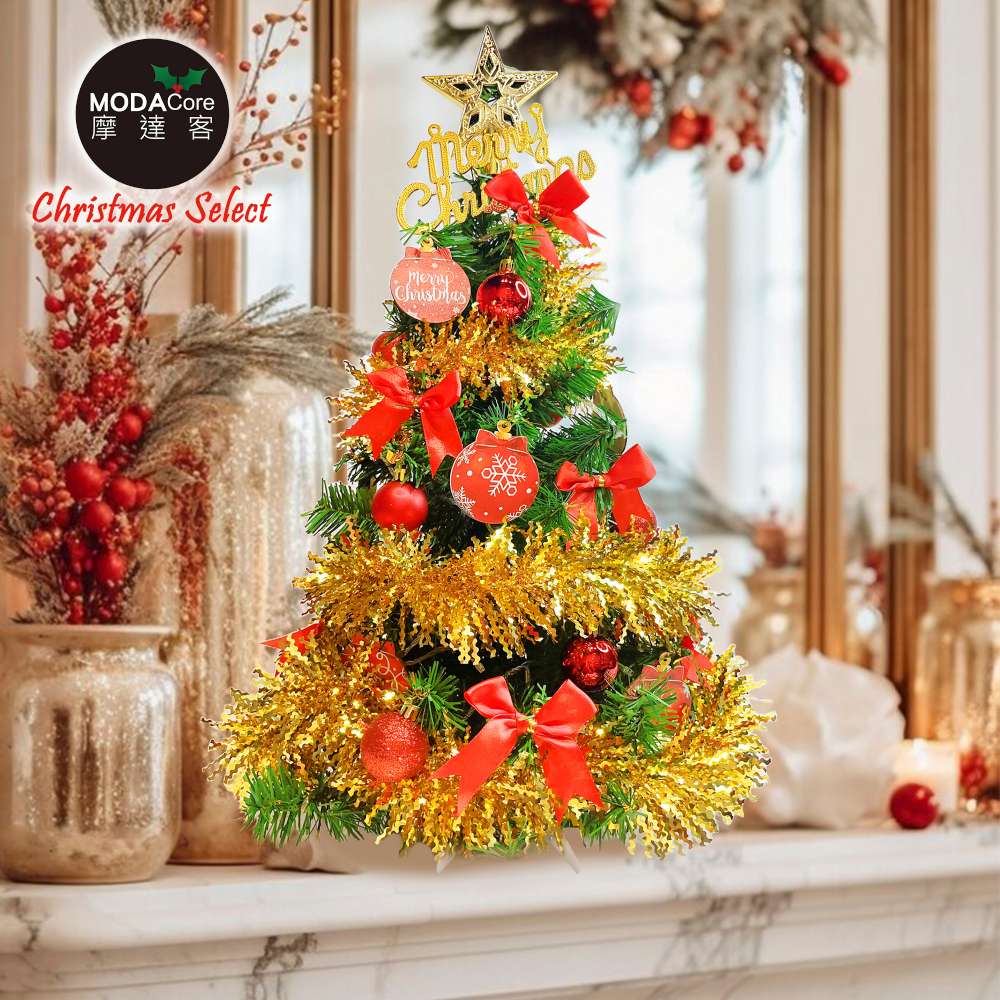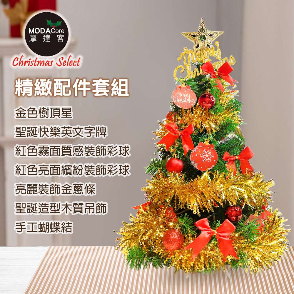 摩達客-台灣製2尺(60cm)精緻裝飾綠色聖誕樹+豐盛木質彩繪紅球金彩系飾品組/不含燈/本島免運費/歐美外銷人氣款