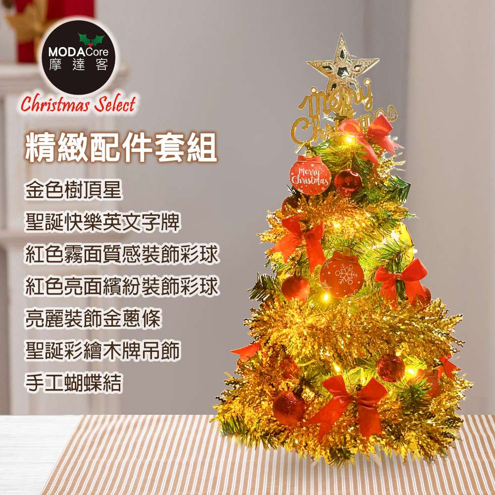 摩達客-台灣製2尺(60cm)精緻裝飾綠色聖誕樹+豐盛木質彩繪紅球金彩系飾品組+50燈LED燈串暖白光-USB電池盒兩用充電/本島免運費/歐美外銷款
