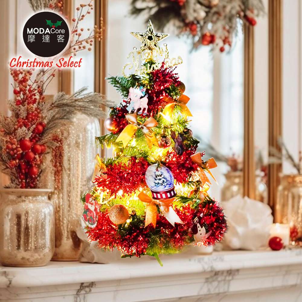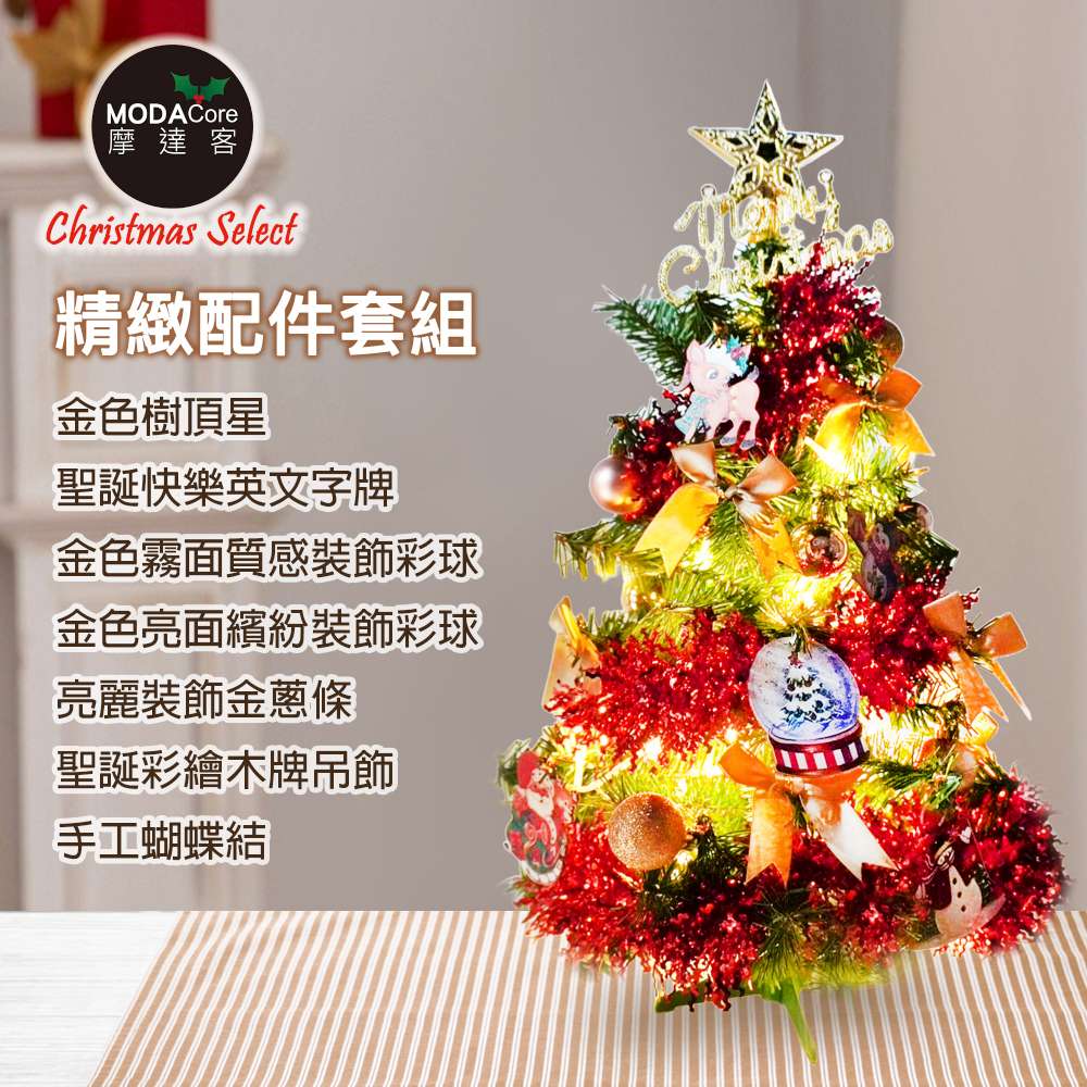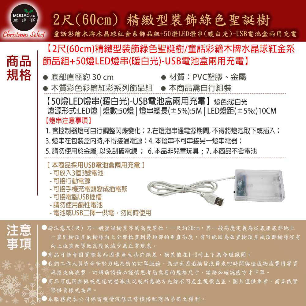 摩達客-台灣製2尺(60cm)精緻型裝飾綠色聖誕樹+童話彩繪木牌水晶球紅金系列飾品組+50燈LED燈串暖白光-USB電池盒兩用充電/本島免運費/歐美外銷款