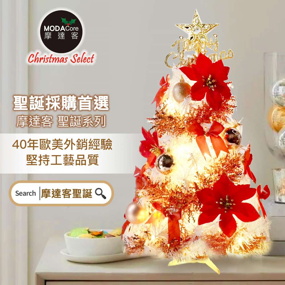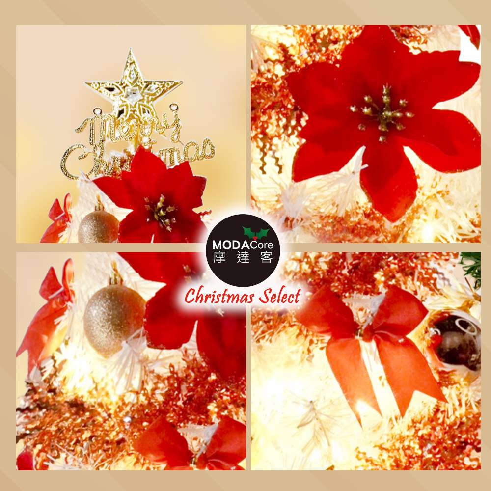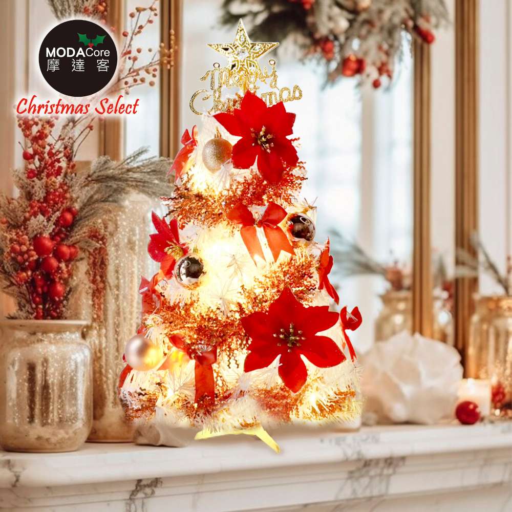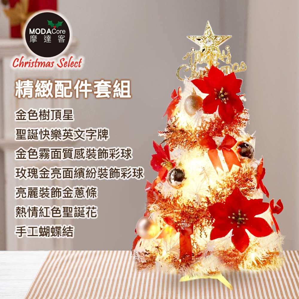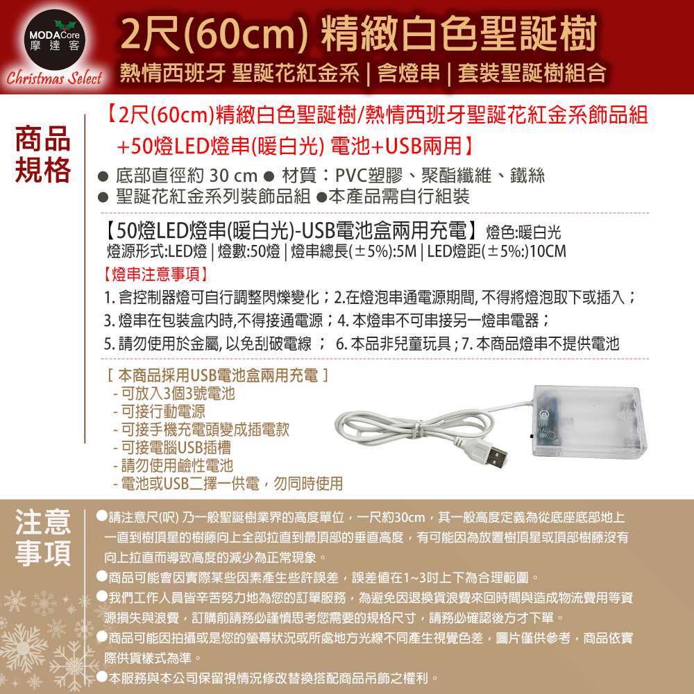 摩達客-台灣製2尺(60cm)精緻白色聖誕樹+熱情西班牙聖誕花紅金系飾品組+50燈LED燈串暖白光-USB電池盒兩用充電/本島免運費MIT歐美外銷款