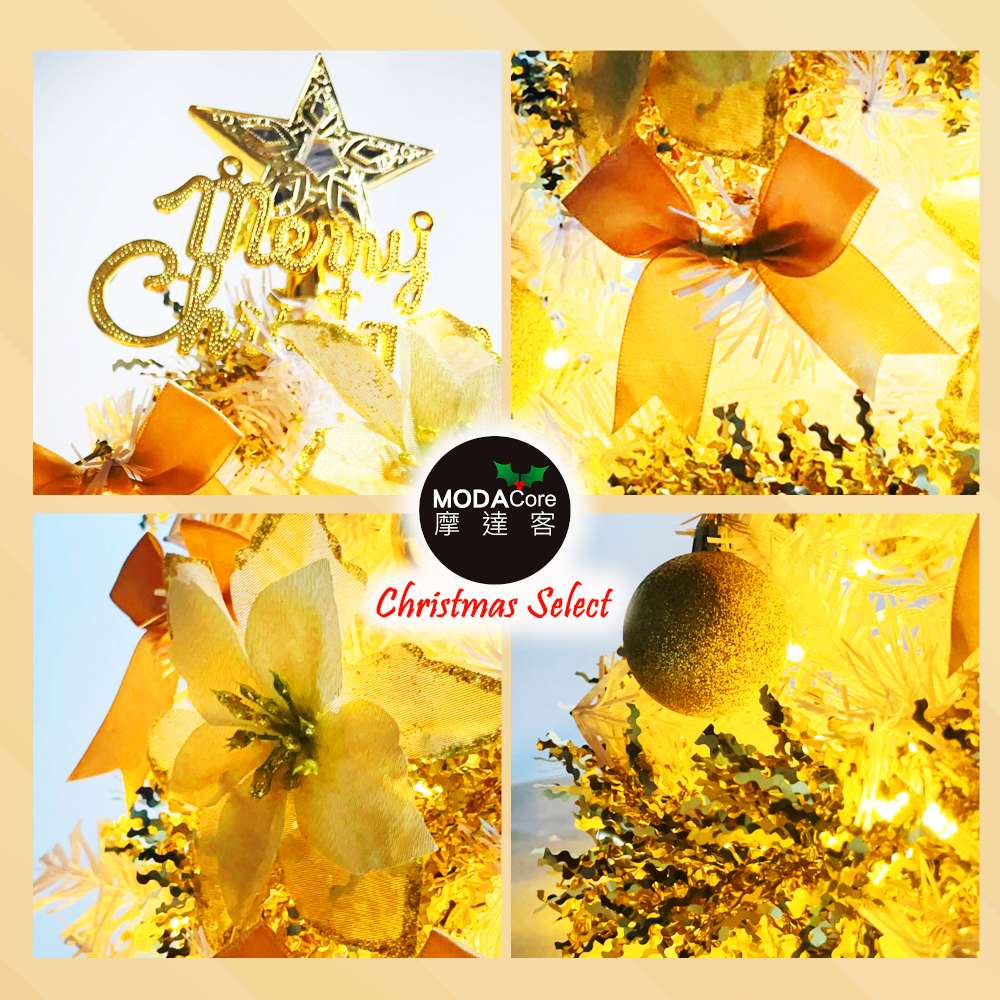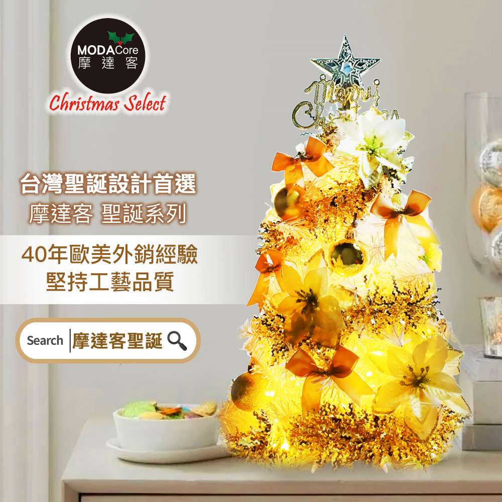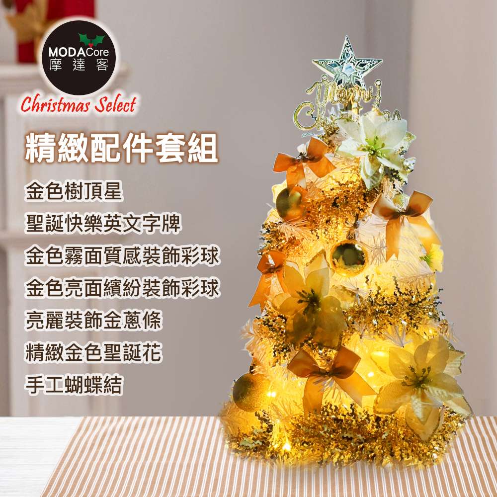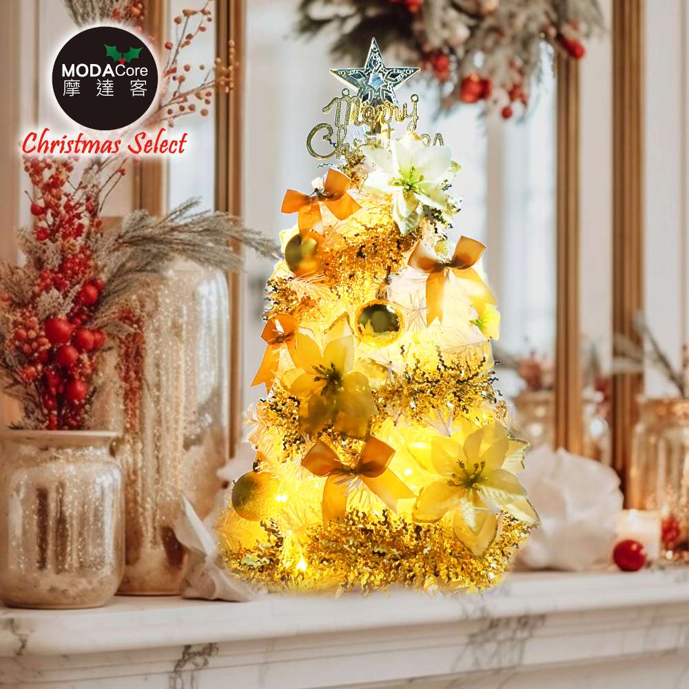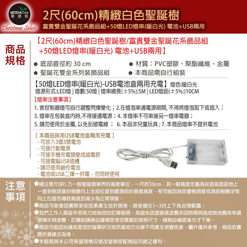 摩達客-台灣製2尺(60cm)精緻白色聖誕樹+熱情西班牙聖誕花紅金系飾品組+50燈LED燈串暖白光-USB電池盒兩用充電/本島免運費MIT歐美外銷款