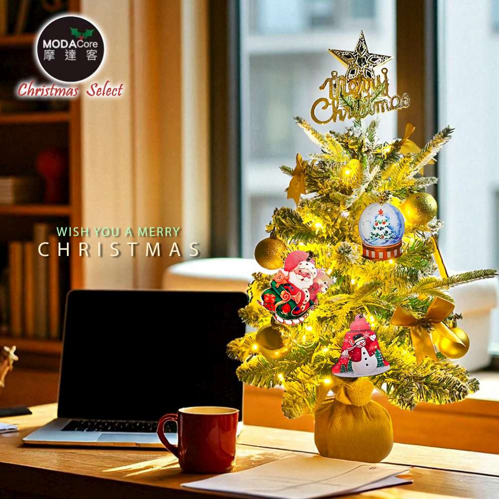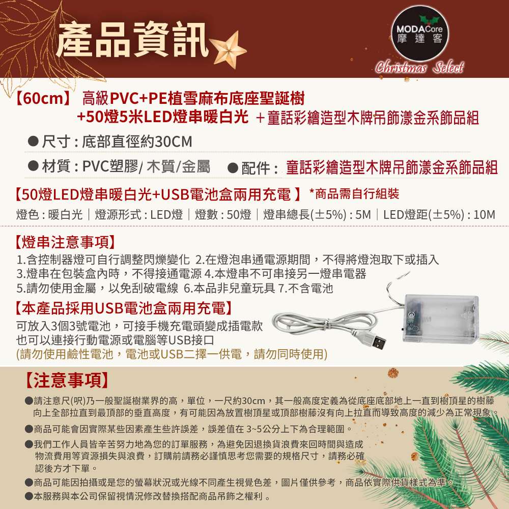 摩達客-60cm(2尺)高級PVC植雪麻布圓底座聖誕樹+童話彩繪木牌吊飾漾金系飾品組+50燈LED燈串暖白光-USB電池盒兩用充電/本島免運費/歐美外銷款