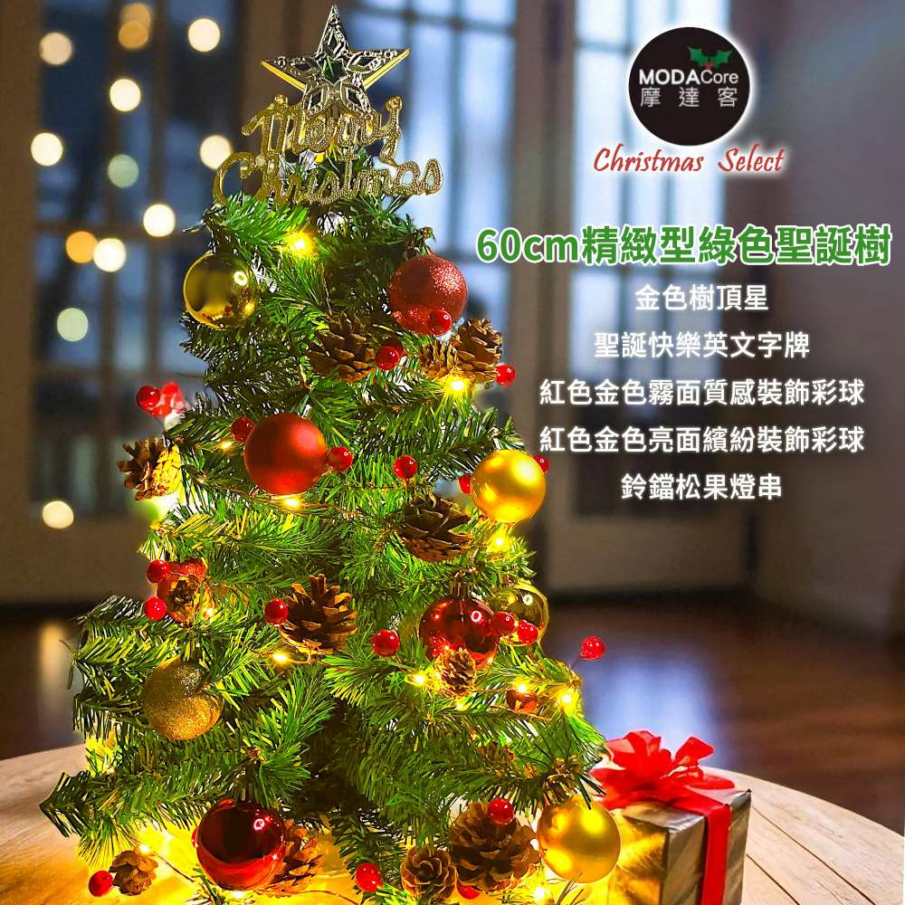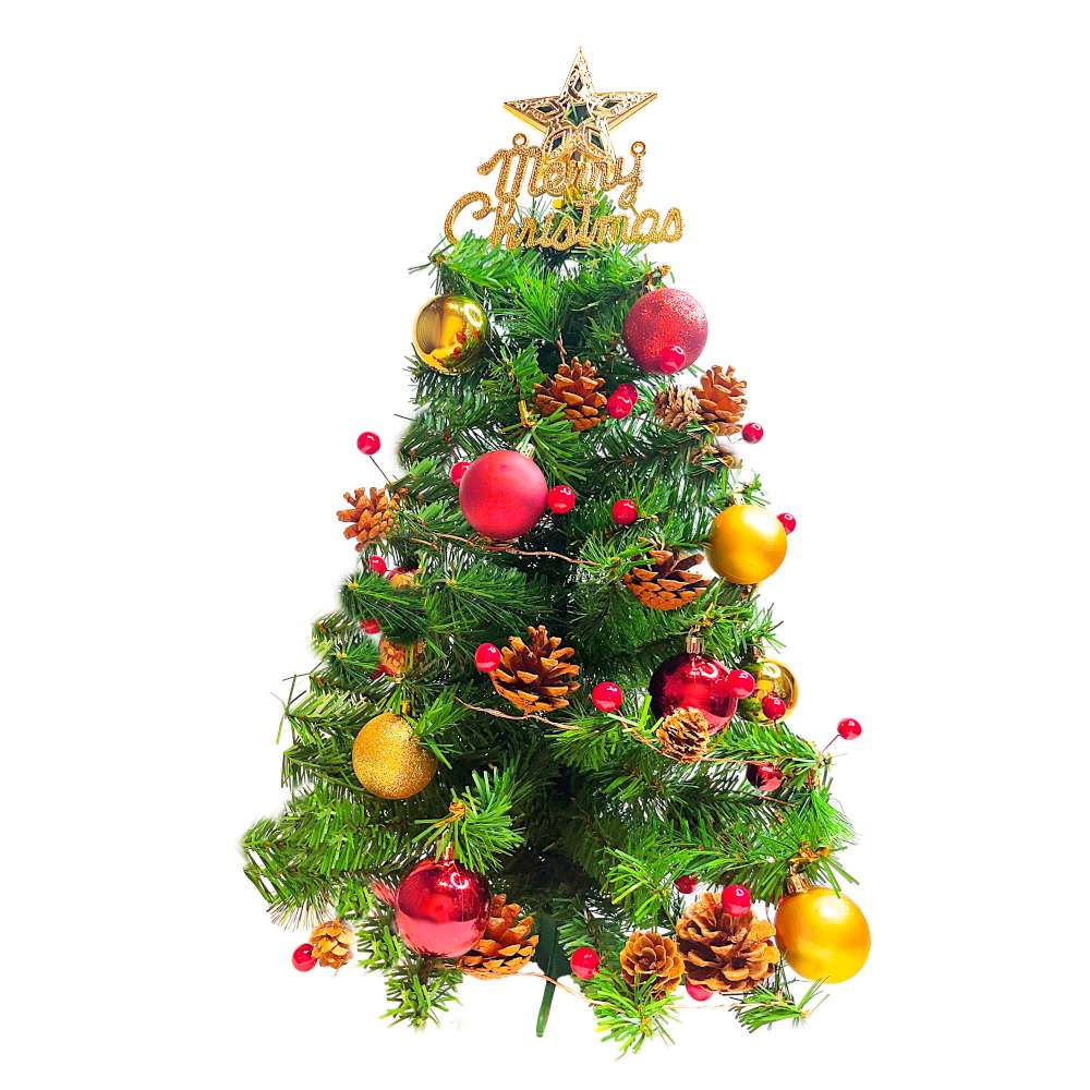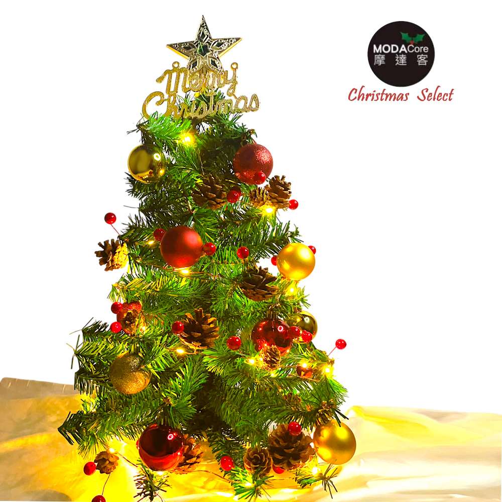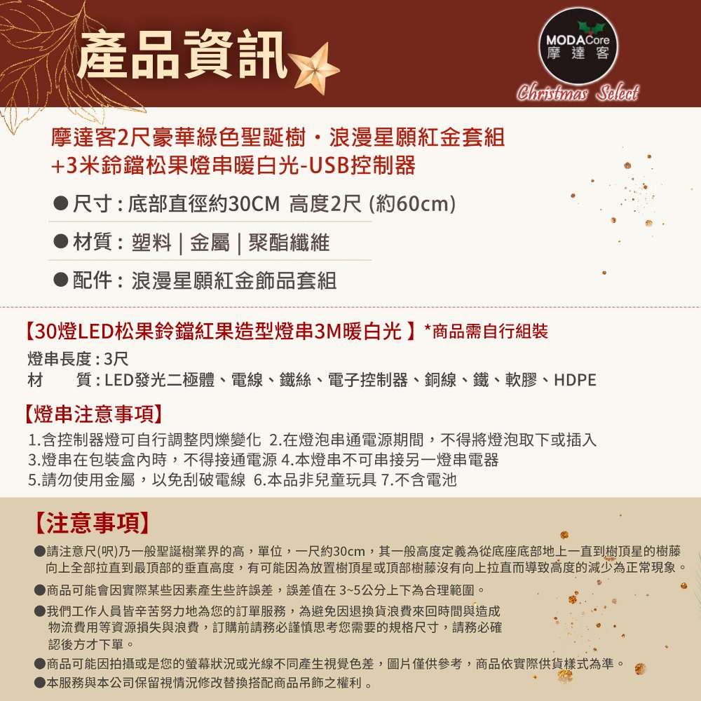 摩達客-2尺豪華綠色聖誕樹・浪漫星願紅金套組+3米鈴鐺松果燈串暖白光-USB控制器