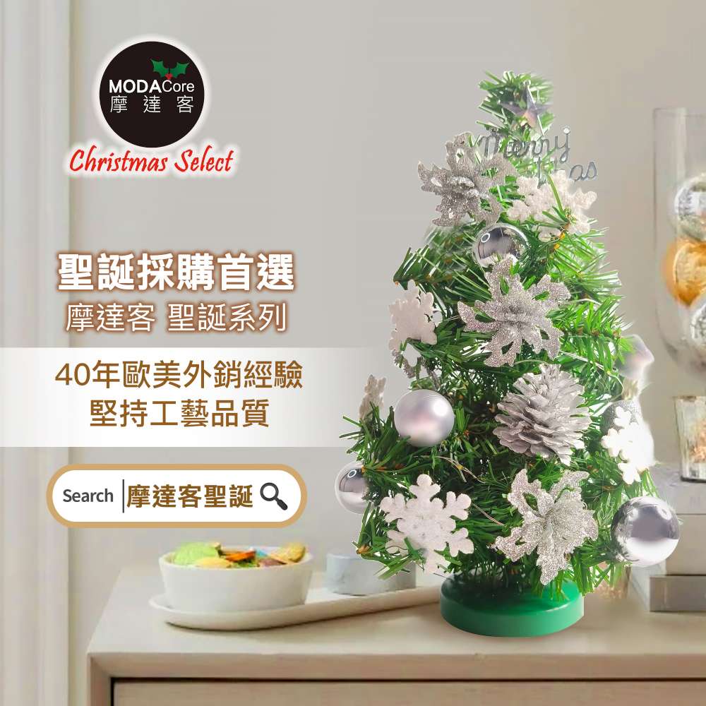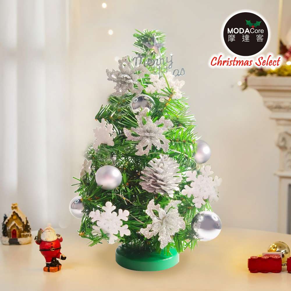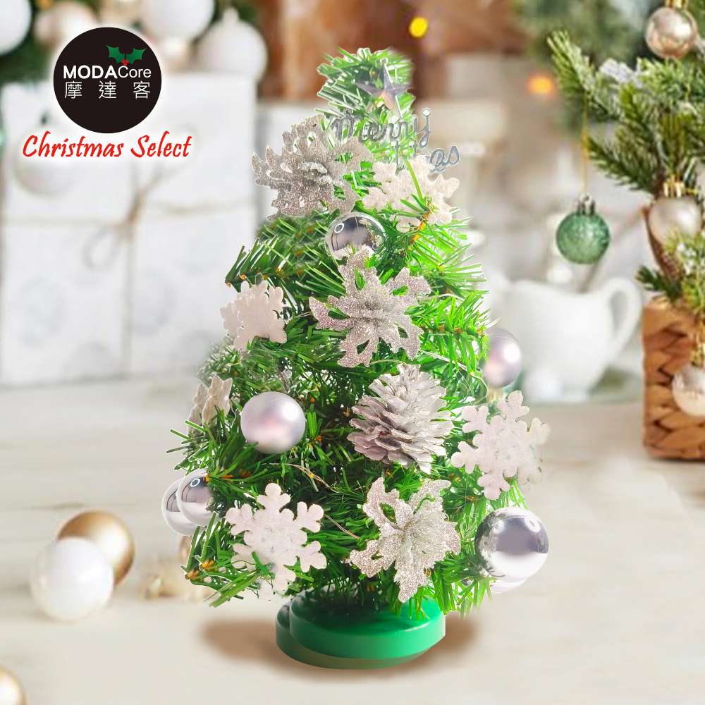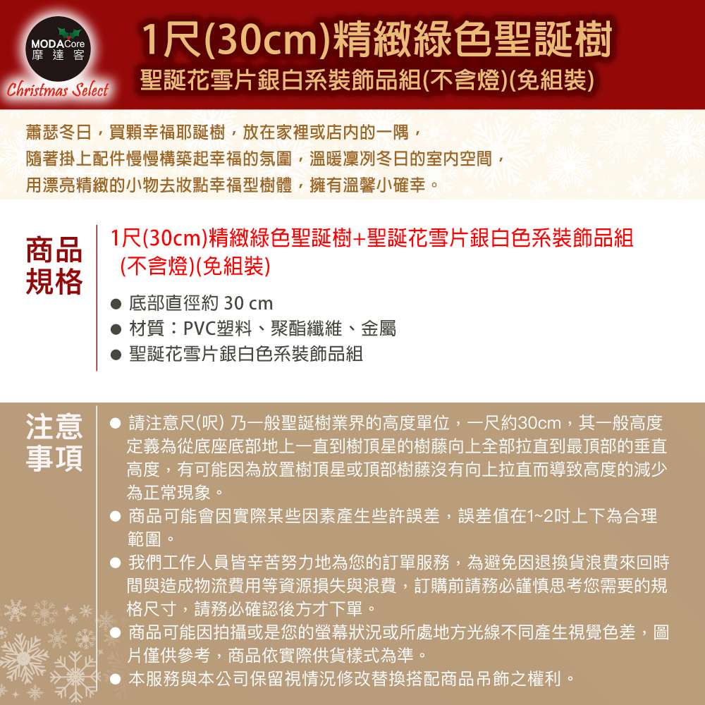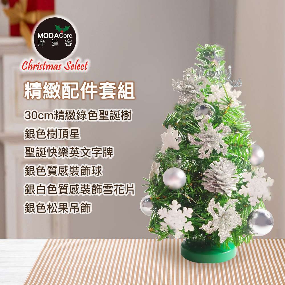 摩達客-台灣製1尺30cm精緻綠色聖誕樹+聖誕花雪片銀白系裝飾品組_免組裝_本島免運費