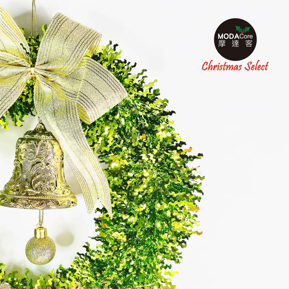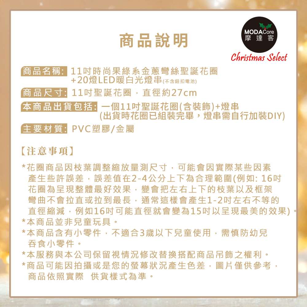 摩達客11吋時尚果綠系金蔥彎絲聖誕花圈+20燈LED暖白光燈串_本島免運費