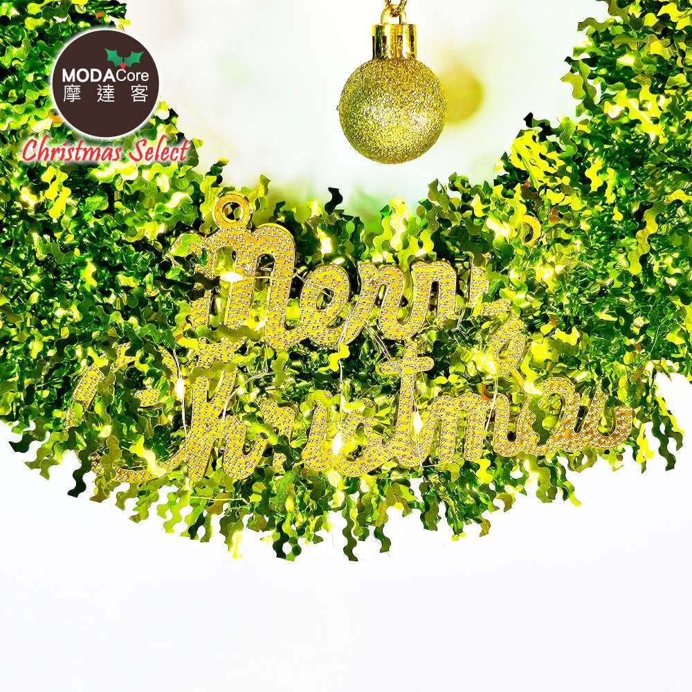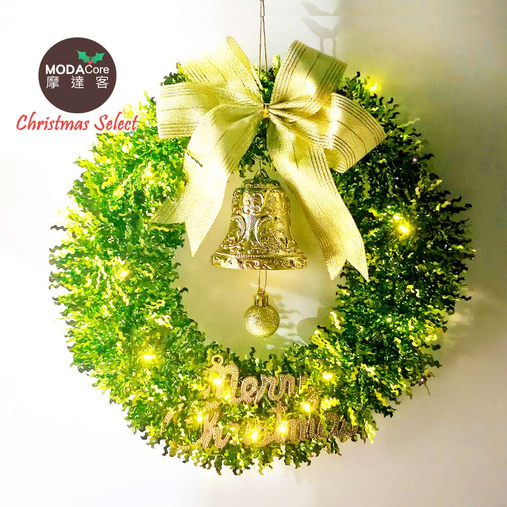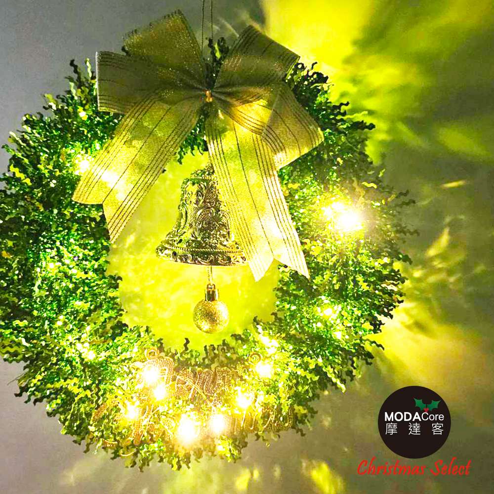 摩達客14吋森林雙綠漸層系金蔥彎絲聖誕花圈+20燈LED暖白光燈串_本島免運費