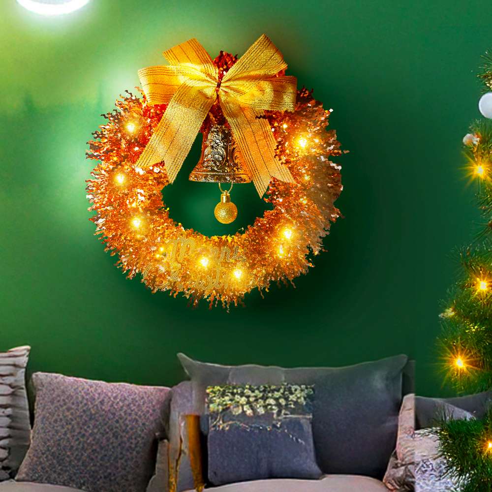 摩達客14吋森林雙綠漸層系金蔥彎絲聖誕花圈+20燈LED暖白光燈串_本島免運費