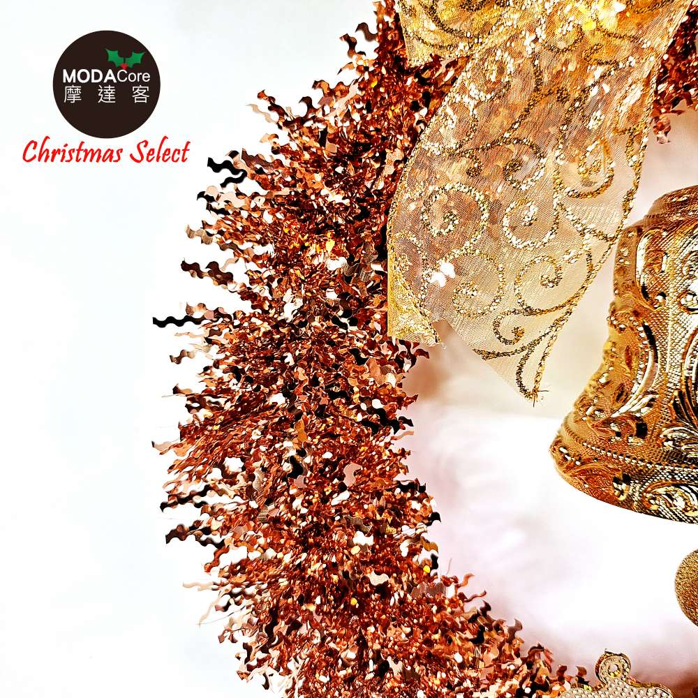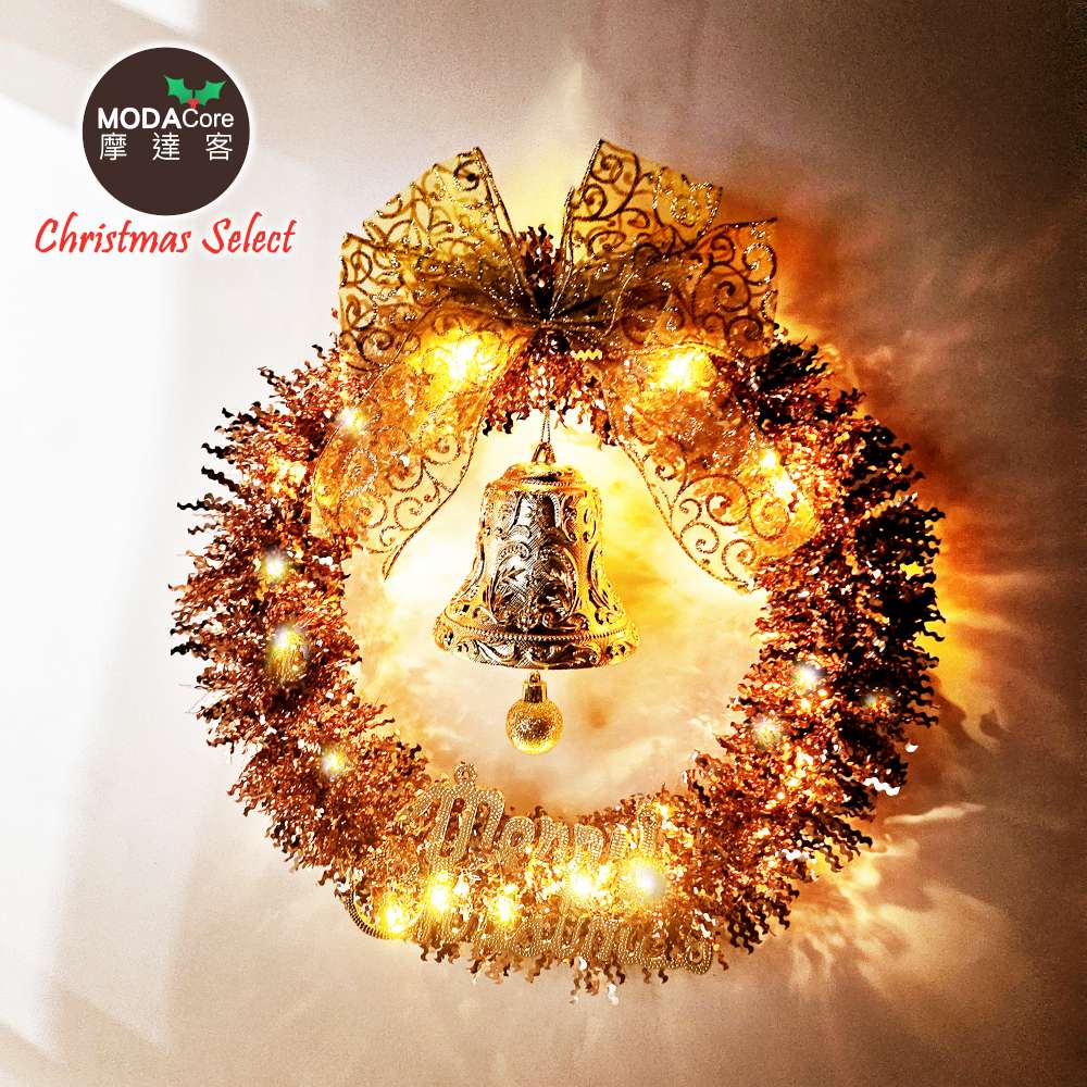 摩達客14吋優雅香檳玫金系金蔥彎絲聖誕花圈+20燈LED暖白光燈串_本島免運費