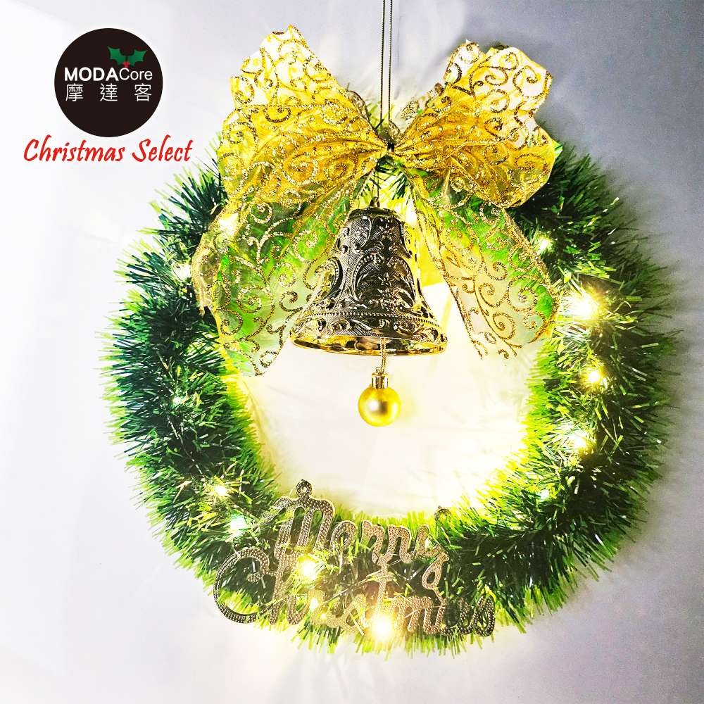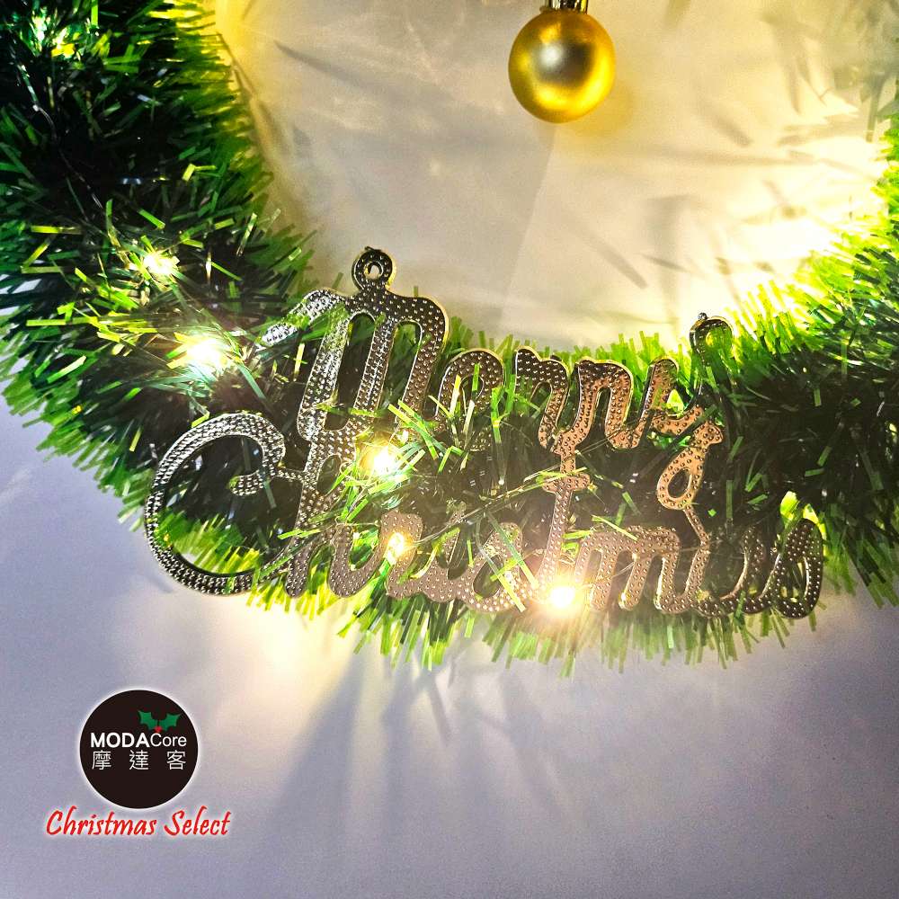 摩達客14吋森林雙綠漸層系金蔥彎絲聖誕花圈+20燈LED暖白光燈串_本島免運費