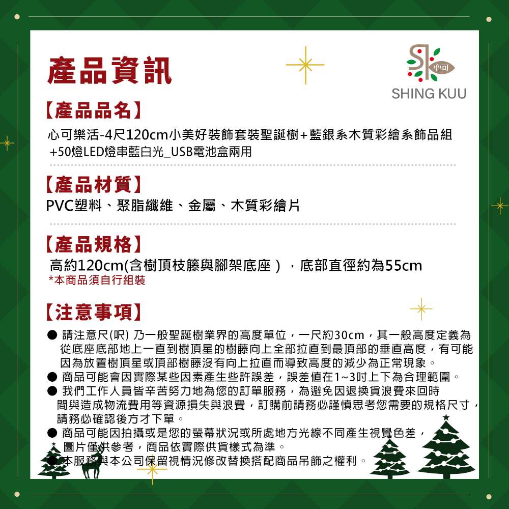 心可樂活-4尺120cm小美好套裝聖誕樹+藍銀系木質彩繪系飾品組+50燈LED燈串藍白光_USB電池盒兩用