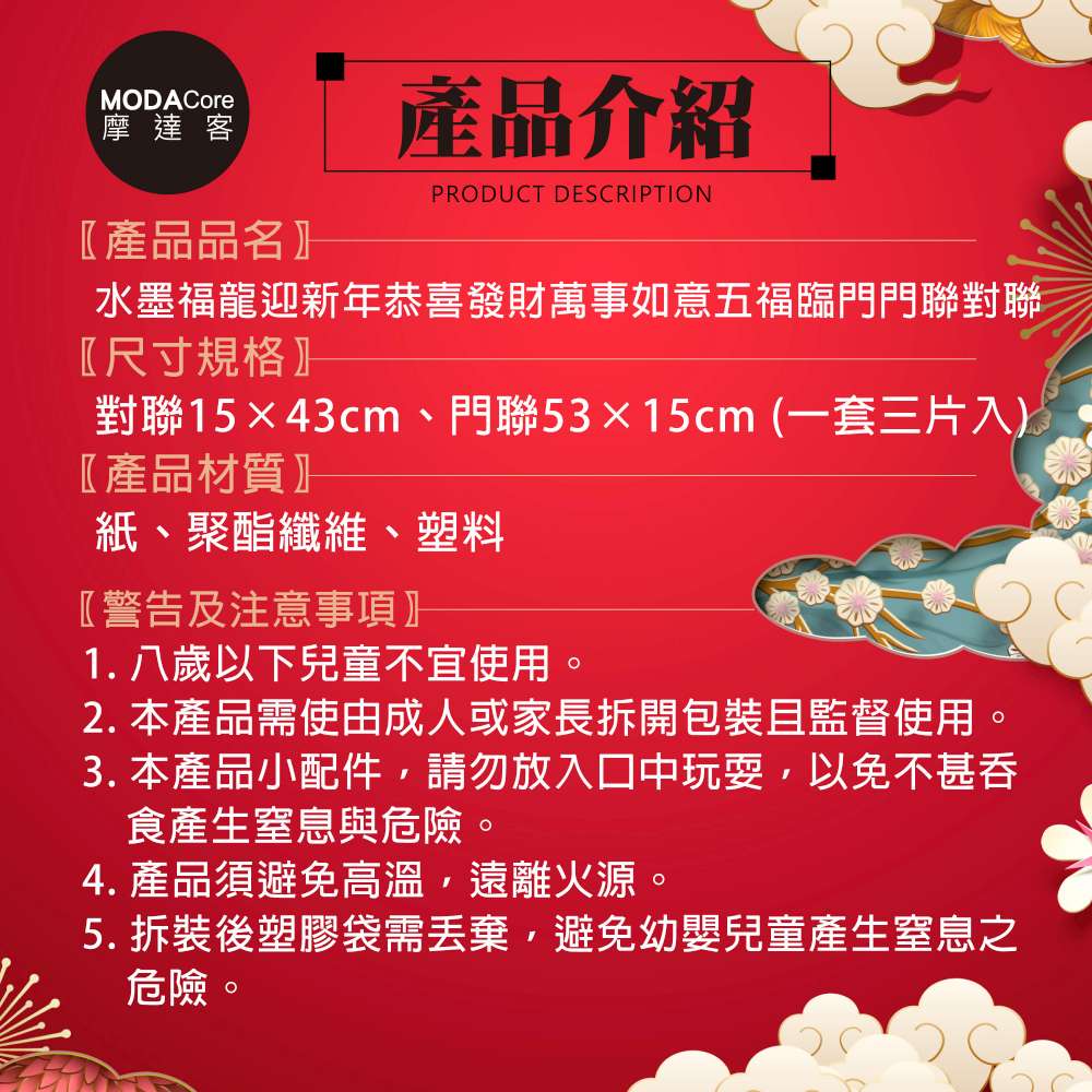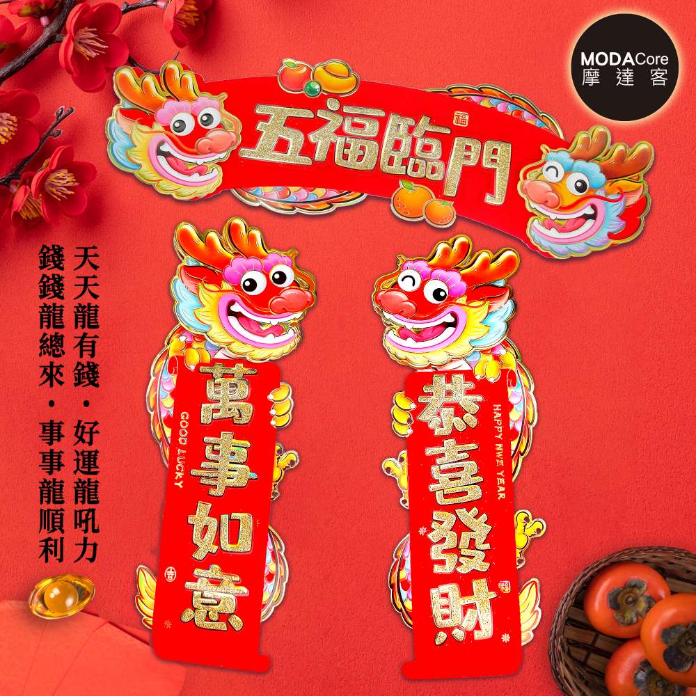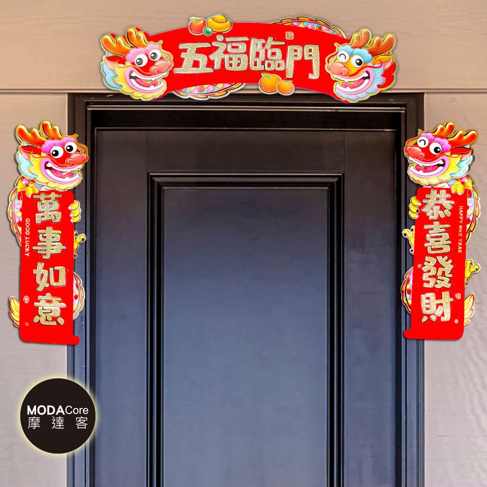 摩達客◉春節開運招財◉龍年五福臨門恭喜發財萬事如意門聯三片組-橫批+左右對聯春聯