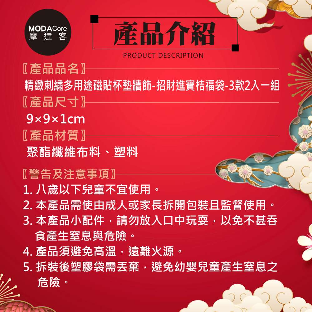 摩達客◉春節開運◉精緻刺繡多用途磁貼杯墊牆飾-招財進寶桔福袋-3款2入一組