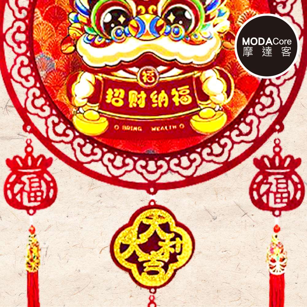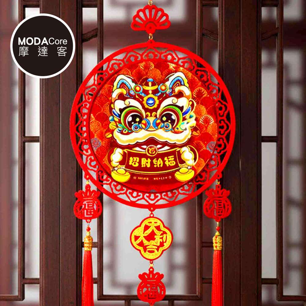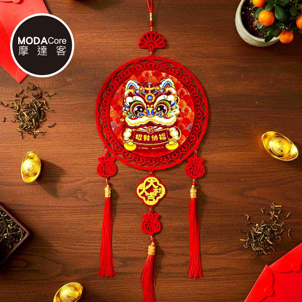 摩達客◉春節開運招財◉精緻立體舞獅波浪緞布底紋原木流蘇吊飾掛飾