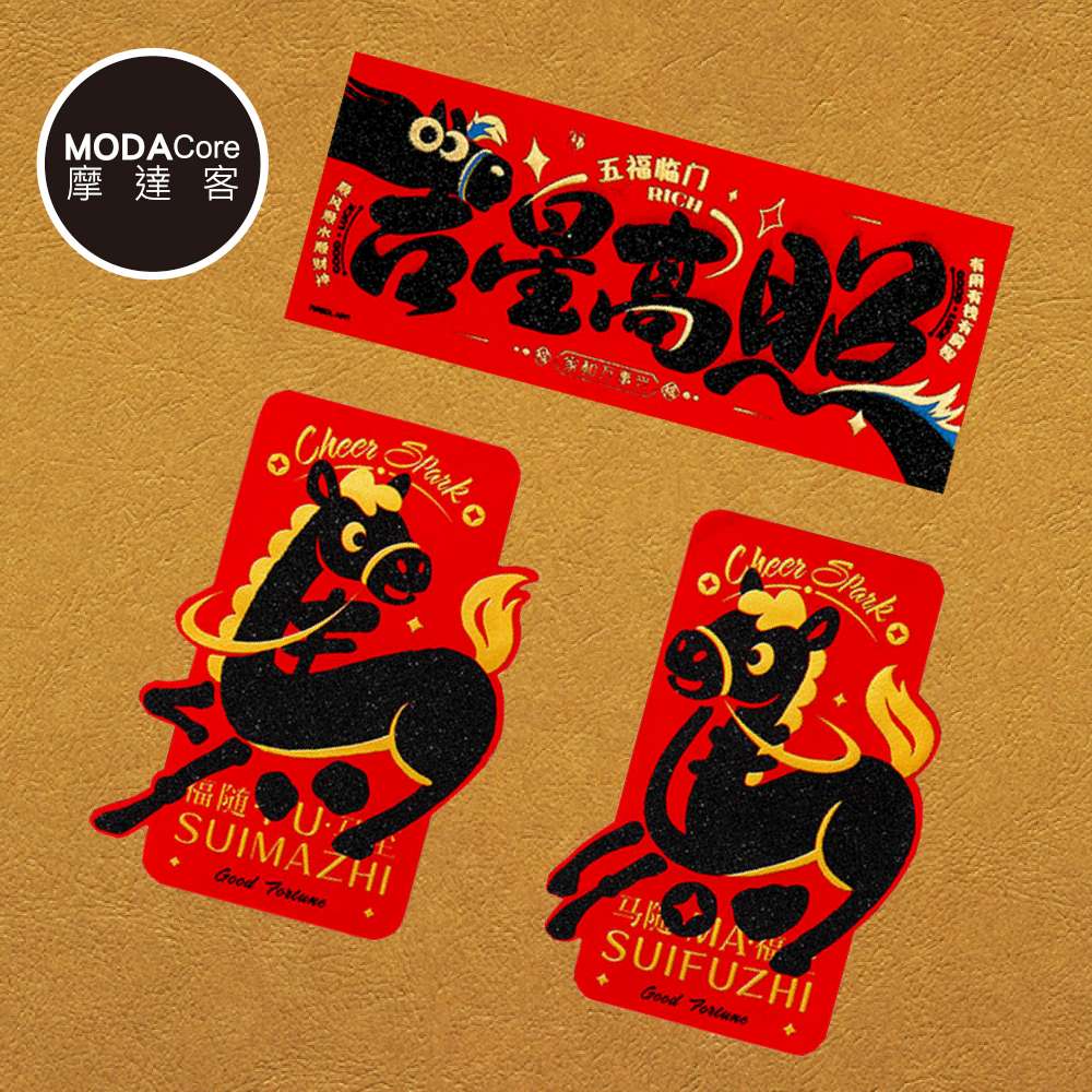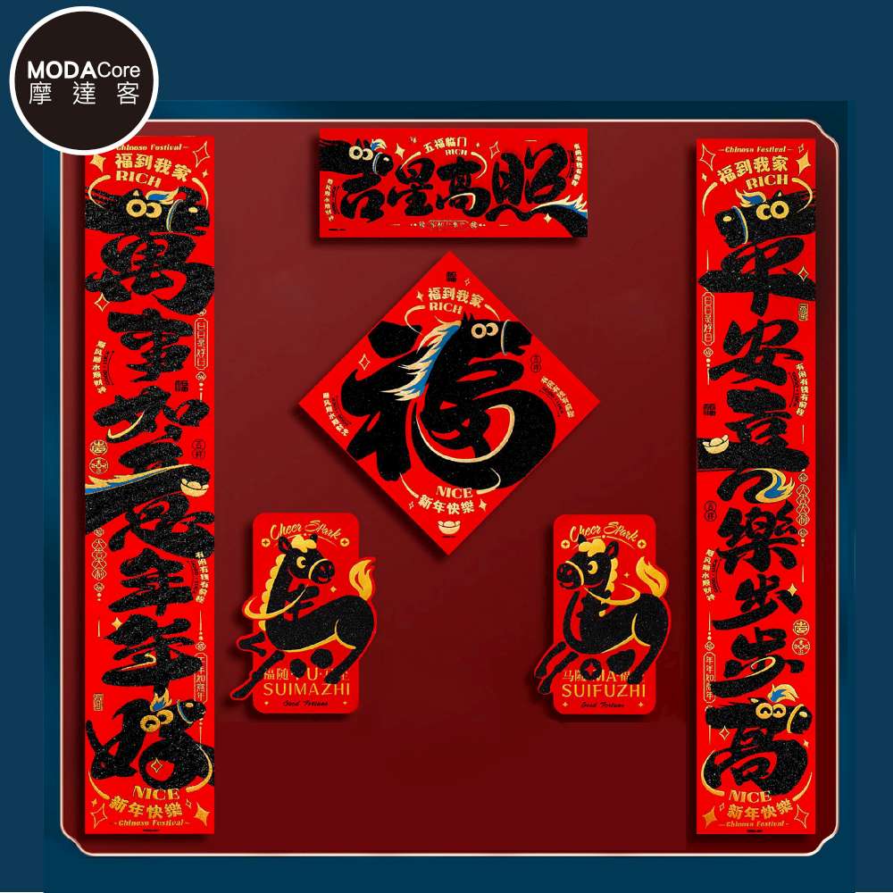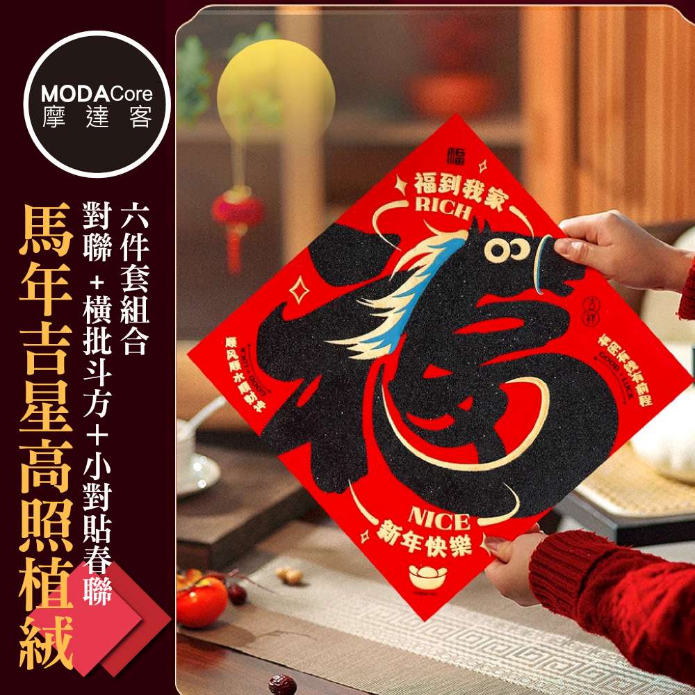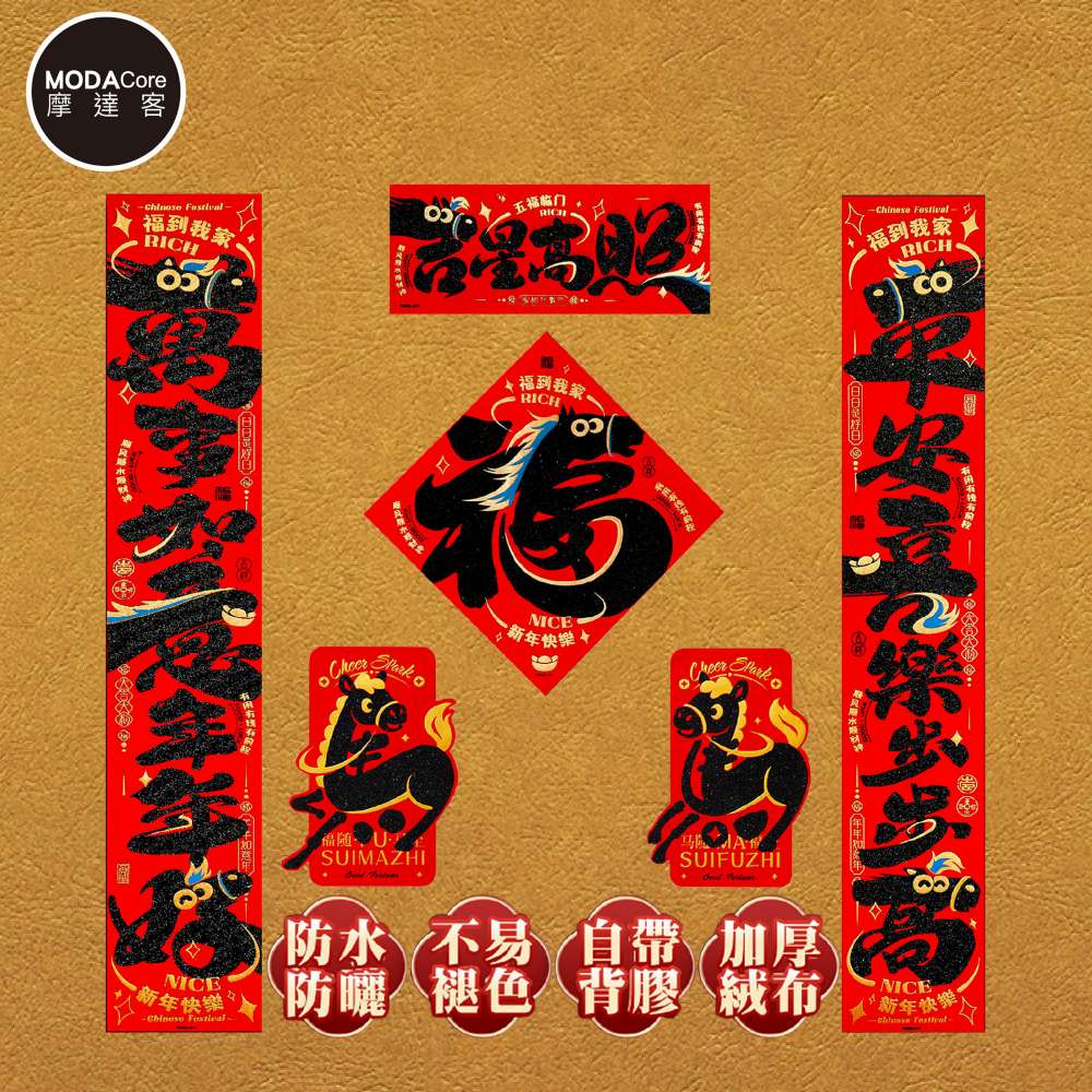 摩達客◉春節開運招財◉馬年吉星高照植絨對聯+橫批斗方+小對貼春聯六件套組合