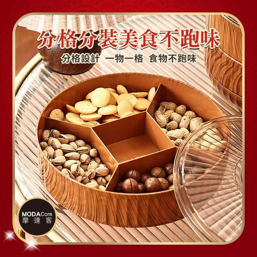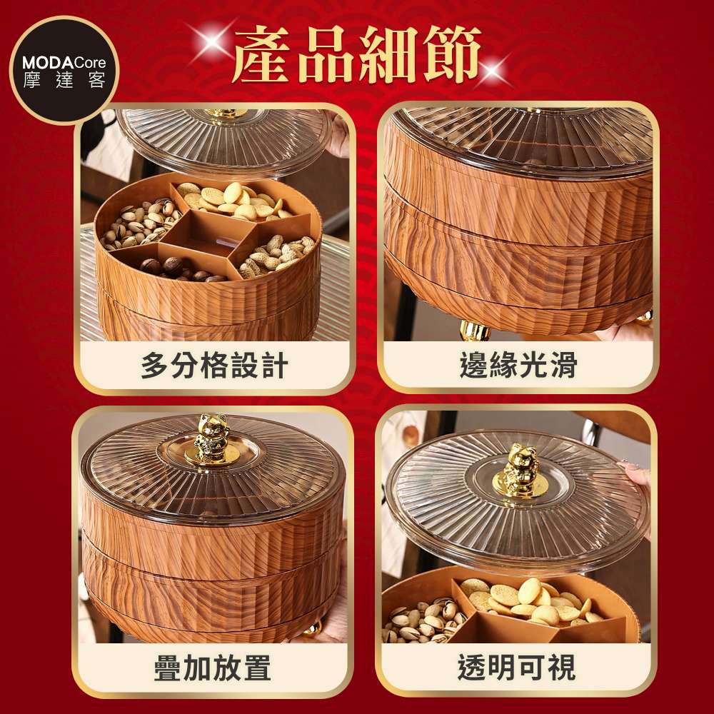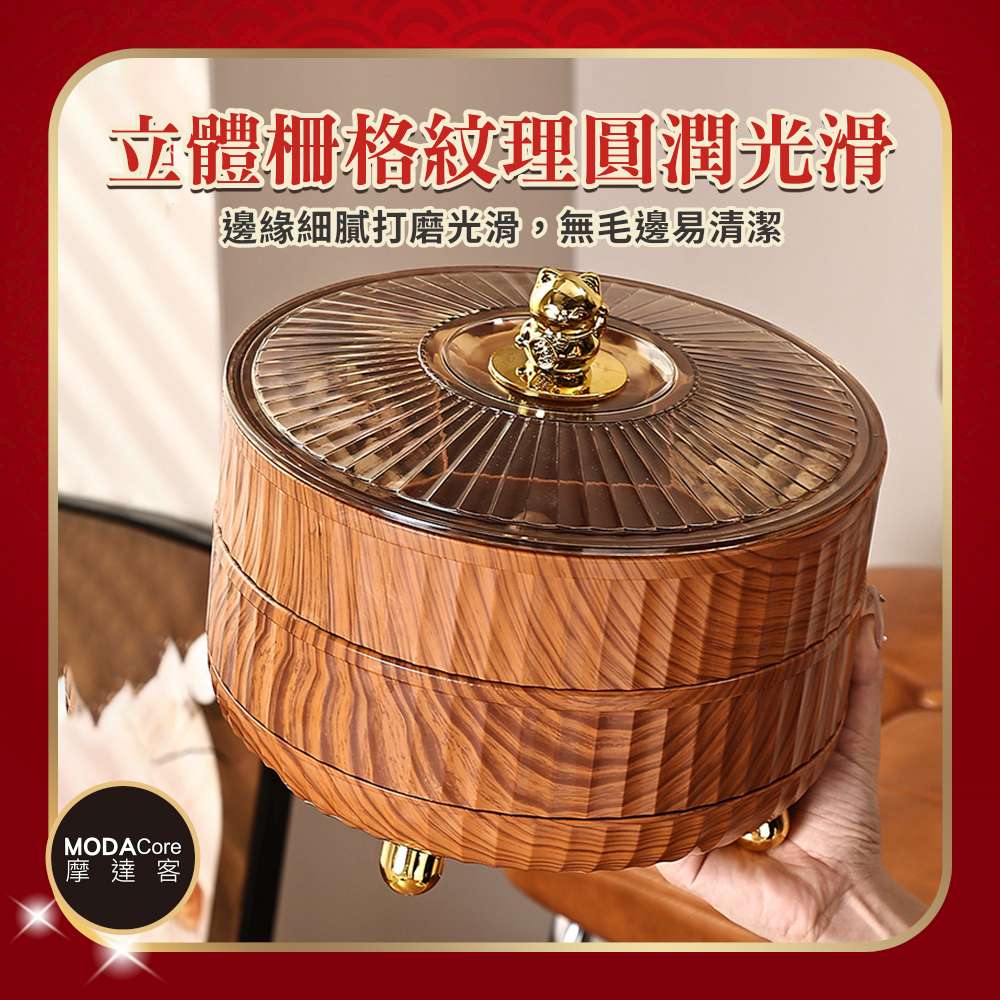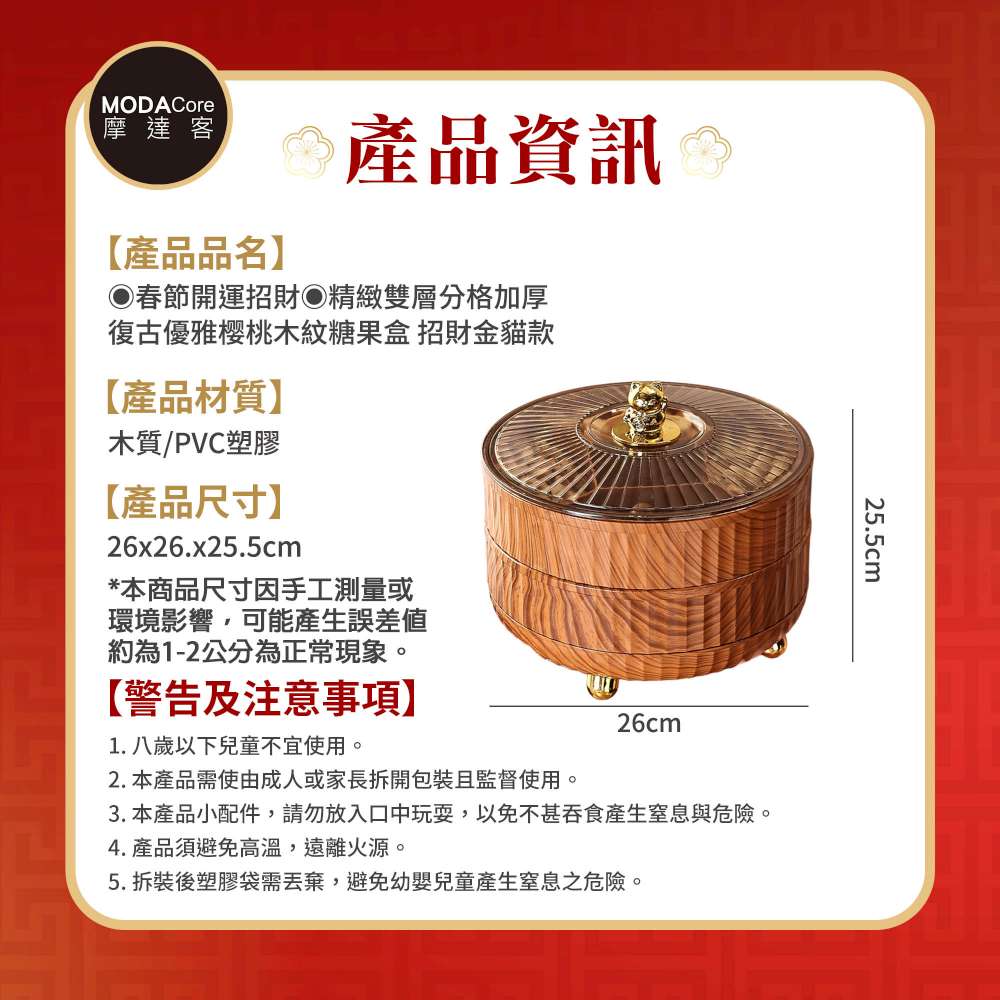 摩達客◉春節開運招財◉精緻雙層分格加厚復古優雅櫻桃木紋糖果盒 招財金貓款 新年開春好運到