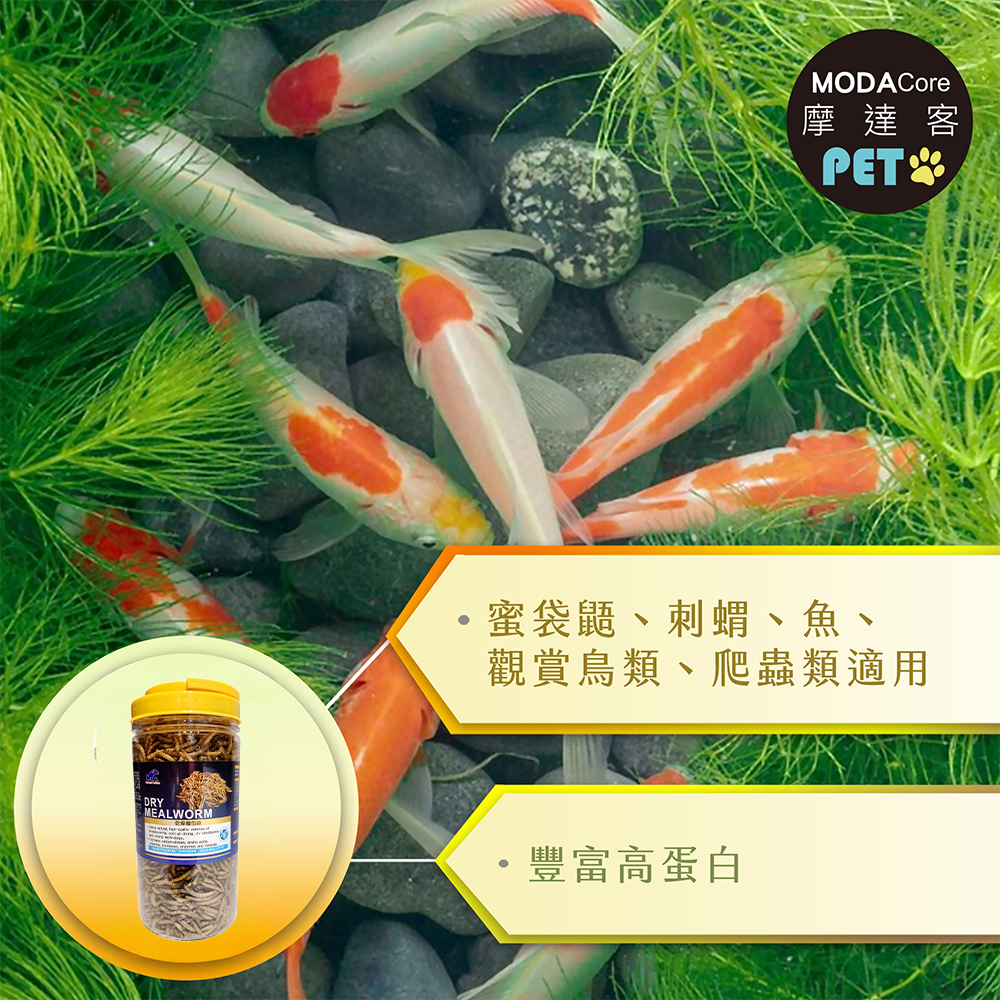 採用天然、優質品種麵包蟲冷風乾燥紫外線殺菌乾早技術加工而成不含人工色素與調味料富含高蛋白