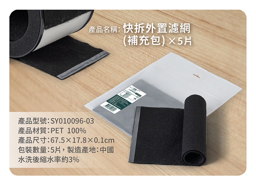 產品名稱:快拆水洗式 外置濾網產品材質:PET 100%產品尺寸:67.5*17.8*0.1 cm製造產地:中國★水洗後縮水率約3%