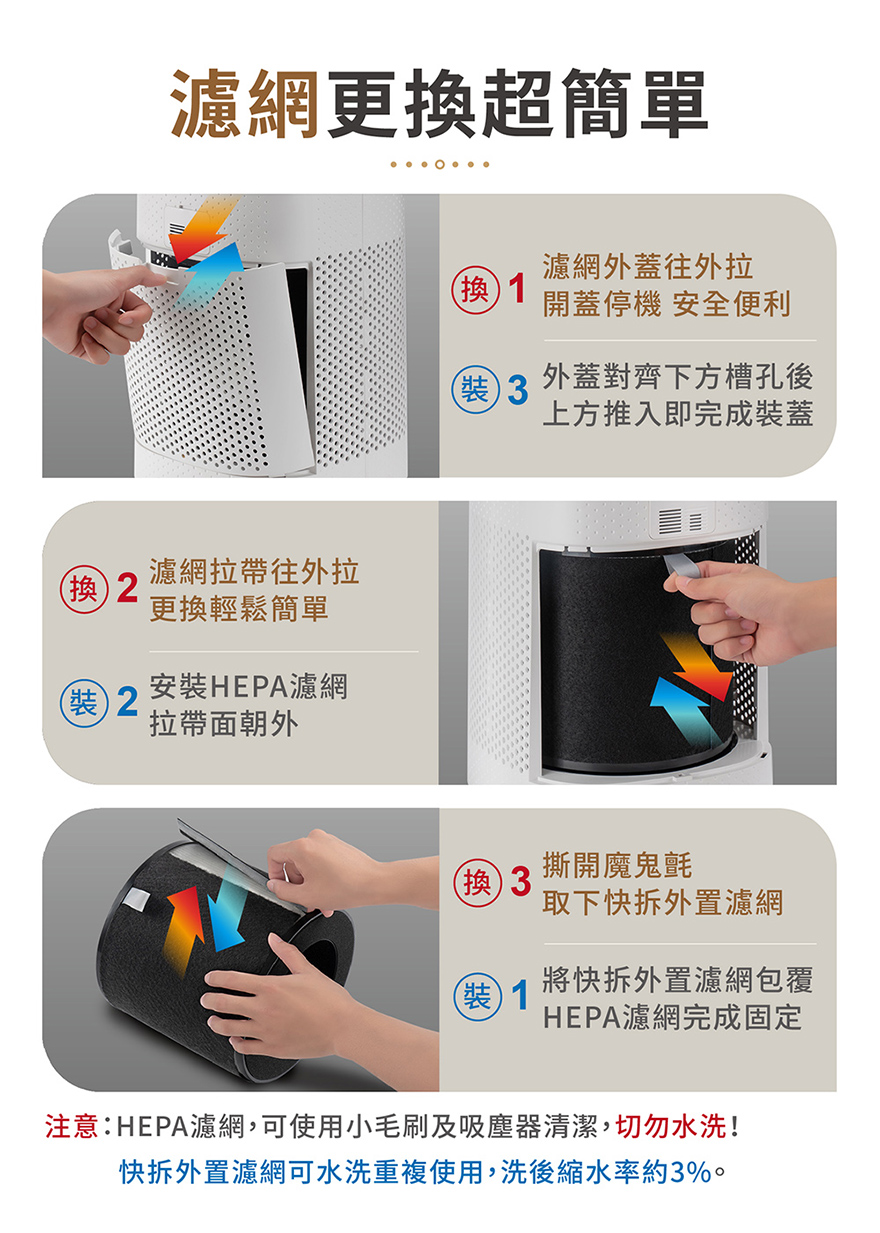 產品名稱:三合一複合HEPA濾網產品規格:HEPA H13等級產品尺寸:外徑20.5cm(內徑13.5cm) x 19.6cm產品重量:350g±5%濾網組成:圓筒型三層複合過濾 ( 空調PET濾網 + HEPA 濾網(熔噴布)+ 活性碳過濾棉)製造產品:中國產品名稱:快拆水洗式 外置濾網產品材質:PET 100%產品尺寸:67.5*17.8*0.1 cm製造產地:中國★水洗後縮水率約3%