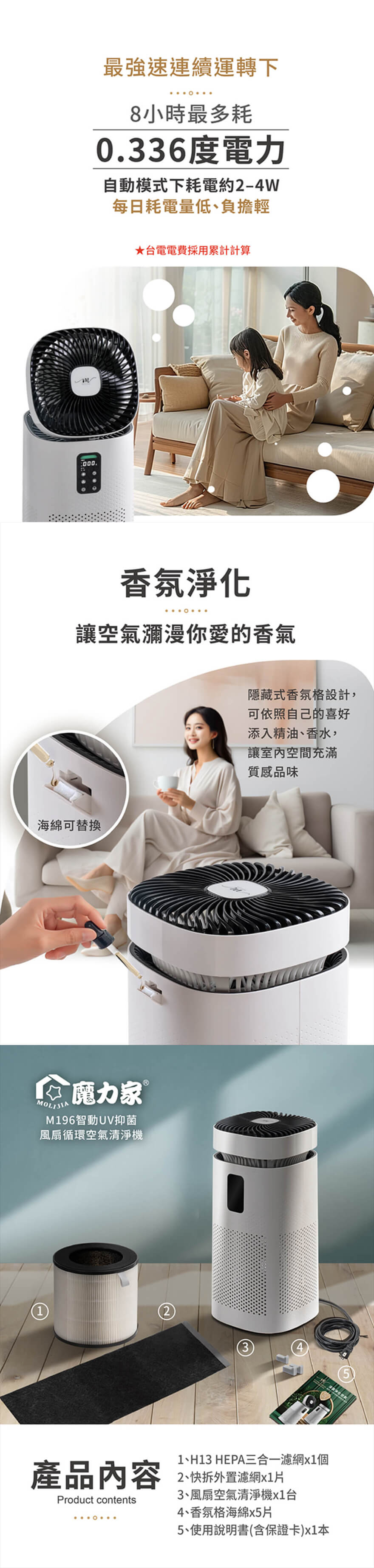 產品型號:BY010096產品名稱:【MOLIJIA 魔力家】M196 風扇循環空氣清淨機產品顏色: 雲岩白產品主體尺寸:25.3 x 25.3 x 52.1cm(含風扇立起 65cm)產品重量:4.7 Kg ±5%(含濾網)額定電壓/頻率:AC 110V / 60Hz額定功率:42W待機功率:1.00W電源線長度:215 cm ±5%能源效率:0.126cmm/W能效等級:三級能效檢測:本產品主機在TURBO模式+風扇2檔的情況下為最高風量輸出。_________________________________過濾檔位模式:自動模式 / 低功耗模式 / 睡眠模式 / 弱檔L / 強檔H / 超強檔 T清淨模式風速:超強檔 T(3.9m/s) ★數據為風力單位,非送風距離過濾馬達等級:BLDC 無刷直流DC24V / 2300RPM ±10%潔淨空氣流量(CADR) : 300 m3/h適用清淨空間:約10坪 (每小時可循環淨化3次)# CADR值為每小時可輸出的空氣流量,僅是用來衡量清淨機效能的指標之一,不能作為評估清淨力的唯一標準。_________________________________風扇運轉檔位:5檔 (可單獨關閉)風扇尺寸: 8吋 = 19cm風扇模式風速:5檔(3.0~4.0m/s) ★數據為風力單位,非送風距離風扇馬達:BLDC 無刷直流24V / 1900RPM±10%、風扇上下手動調整:平放朝上~ 90度 (多角度調整)主機左右自動擺動:停 ~ 60度 ~ 90度_________________________________UV抑菌燈:UVC(用於機體內部抑菌設計)風噪音量:使用T超強檔 <65dB<br>定時關機:0~24小時定時排程:可排定一週7天固定開啟、關閉,APP可設定多段式不同開機、關機時間其他功能:童鎖、UV燈開關、精油薰香格、Wifi聯網,手機APP操作、粉塵自動感測濾網清潔/更換提醒:2000 H/小時製造產地:中國商檢字號:R53615NCC 型式認證號碼:CCAF24Y10220T8【配件規格】產品名稱:三合一複合HEPA濾網產品規格:HEPA H13等級產品尺寸:外徑20.5cm(內徑13.5cm) x 19.6cm產品重量:350g±5%濾網組成:圓筒型三層複合過濾 ( 空調PET濾網 + HEPA 濾網(熔噴布)+ 活性碳過濾棉)製造產品:中國產品名稱:快拆水洗式 外置濾網產品材質:PET 100%產品尺寸:67.5*17.8*0.1 cm製造產地:中國★水洗後縮水率約3%