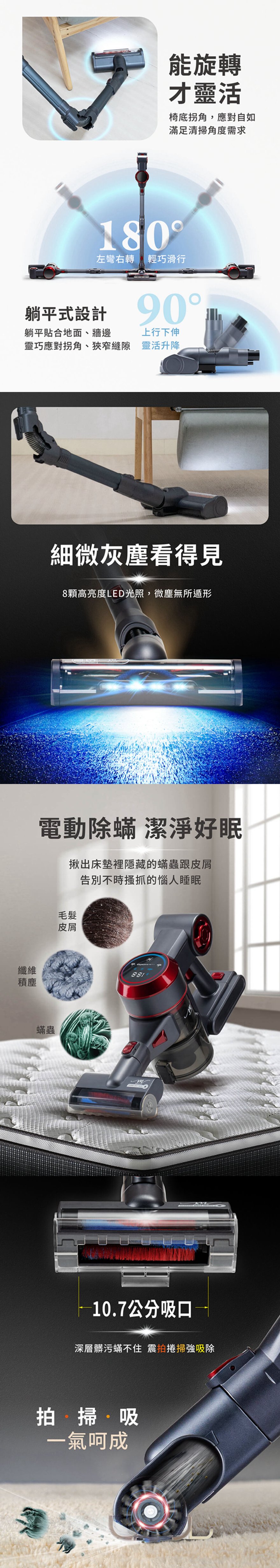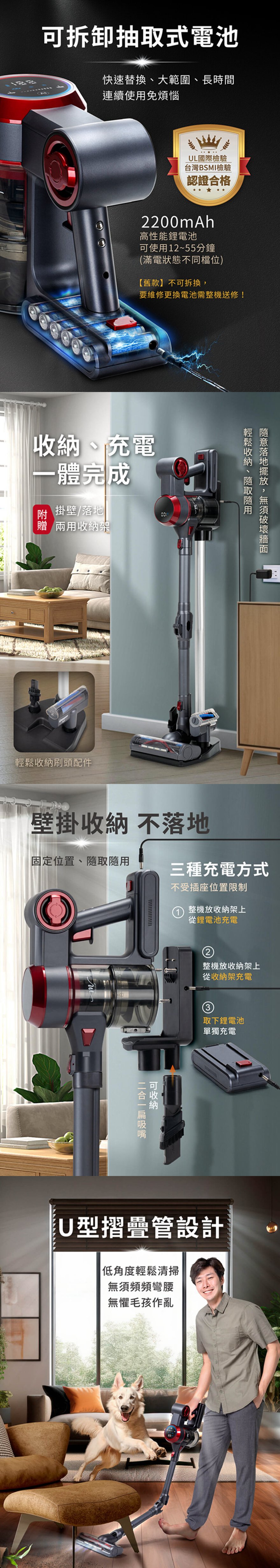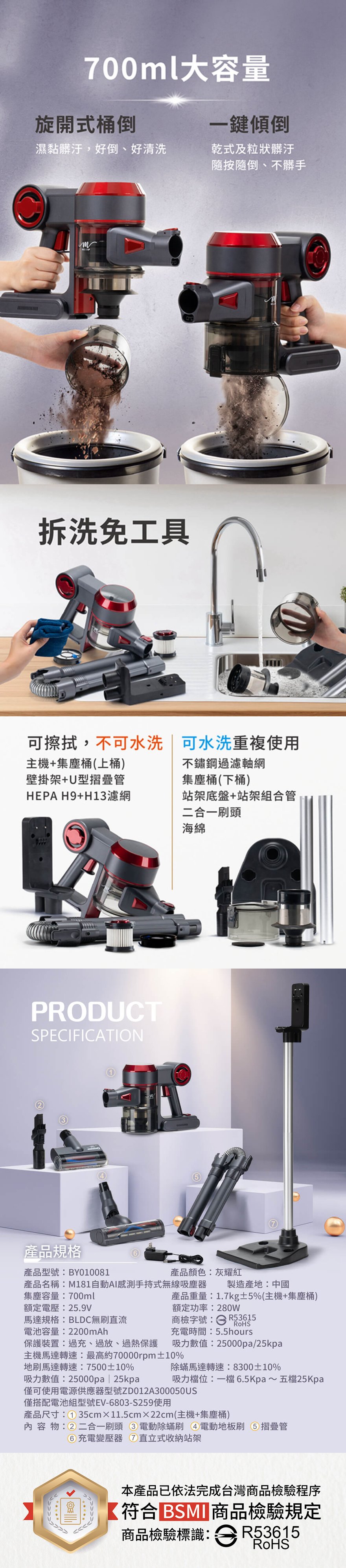 產品型號:BY010081產品名稱:【MOLIJIA 魔力家】M181 自動AI感測手持式無線吸塵器產品顏色:灰耀紅產品尺寸:35 cm*11.5 cm*22 cm (主機+集塵桶)產品重量:1.7kg ± 5% (主機+集塵桶)額定電壓:25.9V額定功率:280W主機馬達規格:BLDC 無刷直流主機馬達轉速:最高約70000rpm ± 10%地刷馬達轉速:7500 ± 10%除蟎馬達轉速:8300 ± 10%電池容量:2200mAh充電時間:5.5 hours集塵容量:700ml吸力數值:25000pa|25kpa吸力檔位:一檔 6.5 Kpa 〜 五檔 25 Kpa內容物:主機x1+摺疊管x1+二合一刷頭x1+直立式收納站架x1+充電變壓器x1+電動地板刷x1+電動除蟎刷x1製造產地:中國商檢字號:R53615僅可使用電源供應器型號ZD012A300050US僅搭配電池組型號EV-6803-S259使用※顏色:如商品圖示,網頁圖片因拍攝關係,若與實品略有差異,顏色以實際出貨為主。※鑑賞期內如需退換貨,商品本身、贈品、包裝彩盒均務必保持完整齊全。※請勿使用非本商品以外的電池,避免造成產品故障發生危險。※請保持商品本體的乾燥,請勿在潮濕處使用。※若商品發生故障,請關閉主機,勿自行拆卸維修本商品,並立即諮詢客服中心。