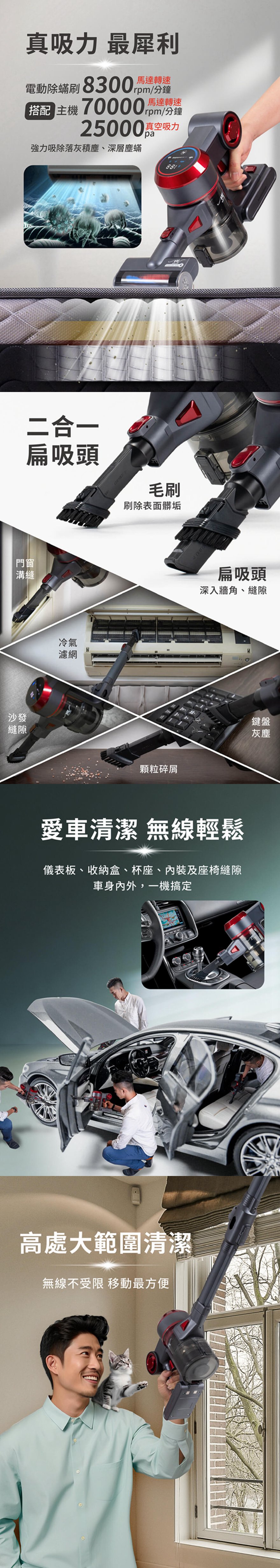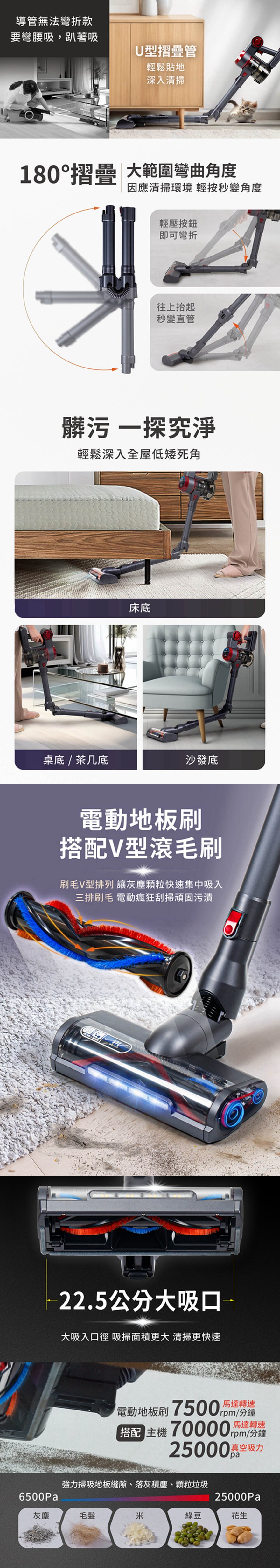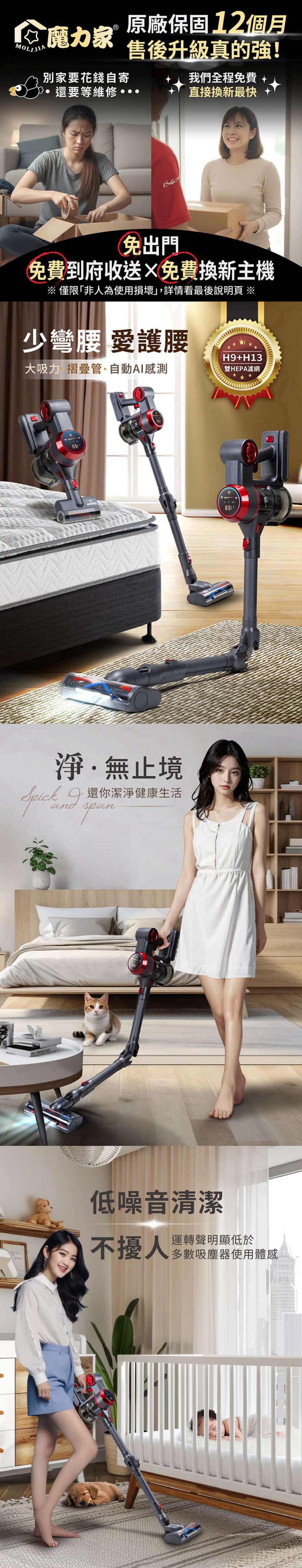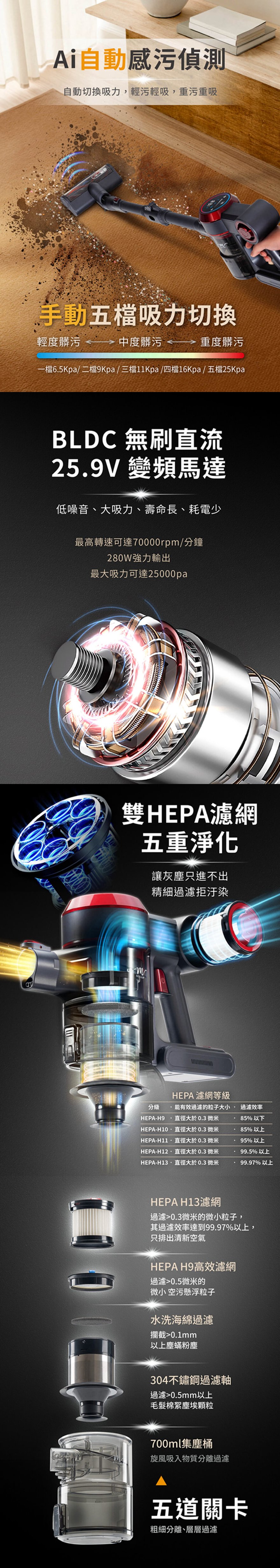 產品型號:BY010081產品名稱:【MOLIJIA 魔力家】M181 自動AI感測手持式無線吸塵器產品顏色:灰耀紅產品尺寸:35 cm*11.5 cm*22 cm (主機+集塵桶)產品重量:1.7kg ± 5% (主機+集塵桶)額定電壓:25.9V額定功率:280W主機馬達規格:BLDC 無刷直流主機馬達轉速:最高約70000rpm ± 10%地刷馬達轉速:7500 ± 10%除蟎馬達轉速:8300 ± 10%電池容量:2200mAh充電時間:5.5 hours集塵容量:700ml吸力數值:25000pa|25kpa吸力檔位:一檔 6.5 Kpa 〜 五檔 25 Kpa內容物:主機x1+摺疊管x1+二合一刷頭x1+直立式收納站架x1+充電變壓器x1+電動地板刷x1+電動除蟎刷x1製造產地:中國商檢字號:R53615僅可使用電源供應器型號ZD012A300050US僅搭配電池組型號EV-6803-S259使用※顏色:如商品圖示,網頁圖片因拍攝關係,若與實品略有差異,顏色以實際出貨為主。※鑑賞期內如需退換貨,商品本身、贈品、包裝彩盒均務必保持完整齊全。※請勿使用非本商品以外的電池,避免造成產品故障發生危險。※請保持商品本體的乾燥,請勿在潮濕處使用。※若商品發生故障,請關閉主機,勿自行拆卸維修本商品,並立即諮詢客服中心。