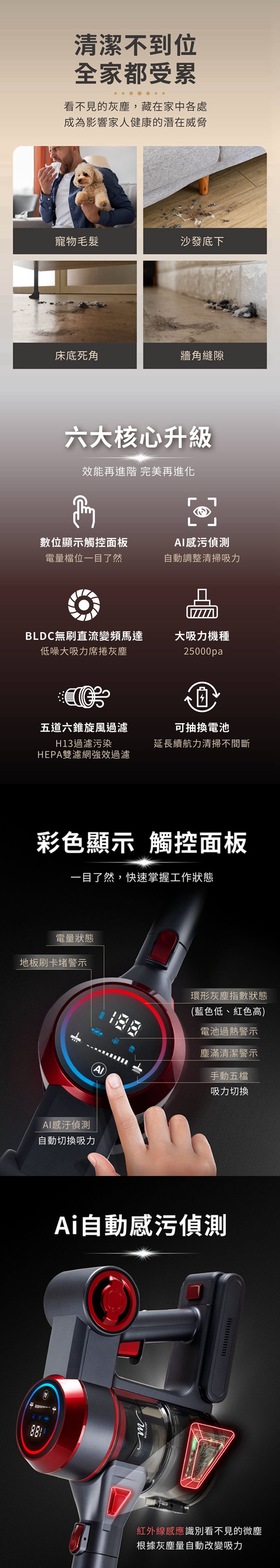 【MOLIJIA 魔力家】M181 自動AI感測手持式無線吸塵器-灰耀紅