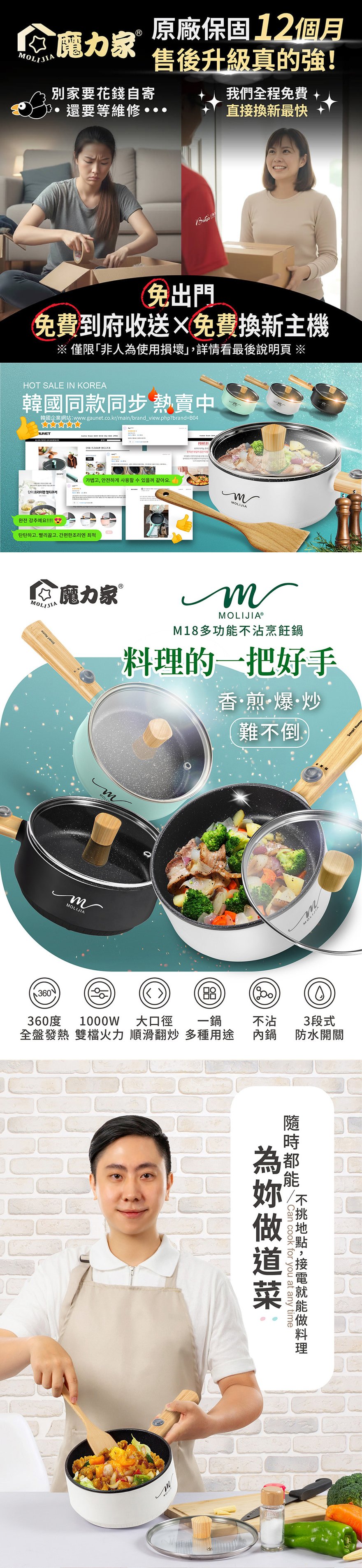 【MOLIJIA 魔力家】1.6L-M18多功能美食料理不沾電火快煮烹飪鍋+M1812不鏽鋼蒸籠-白木紋