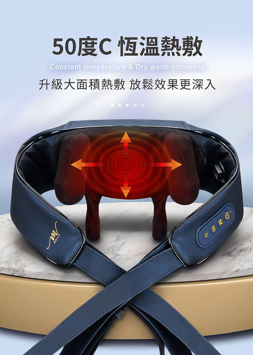 產品型號:BY060037B產品名稱:【MOLIJIA 魔力家】M637 無線免手持/充電式肩頸按摩帶產品顏色:黑曜藍產品尺寸:長33cm*寬51cm*高17cm產品重量:1.2kg±5%(不含配件)電池容量:2000 mAh鋰電池連續使用時間:100~130分鐘(10~13次)定時停止時間:10分鐘充電電壓/接口:5V / TYPE-C充飽電時間:約4.5小時 (以5V 1A充電計算)TYPE-C充電線長:101cm±2%※(BLDC直流無刷馬達)※保護機制:充電時無法使用包裝內容:主機x1、TYPE-C充電線x1、說明書x1商檢字號:R53615製造產地:中國(台灣設計)專利證號:D230991(期限 20240421~20270420)於購買日期(或製造日期)起算365日內,非人為不當使用的新品故障瑕疵維修,由本公司派車【免費來回收送】維修,所產生的費用由本公司全額負擔。(限台灣本島內收送)產品在正常使用範圍內,享有自購買日期(或製造日期)起算12個月內,產品零件免費維修更換的保固服務。※建議定期擦拭外部皮套,高級PU皮革肩帶可使用皮革保養乳或一般乳液擦拭。※符合有下列所述時,請勿使用或是在專業醫師指導下使用:1.孕婦、骨質疏鬆症患者、使用心臟起博器者。2.高血壓、心臟病、腦動脈化硬化、腦血栓患者。3.使用中有胸悶、呼吸不順或其他不適症狀時,請立即停止使用。.4.飯後30分鐘內。5.重傷初癒或剛開完刀,身體尚未復元或身體有傷口者。6. 按摩器有加熱功能,熱感覺遲緩者,使用時需有人員在旁協助,密切注意。