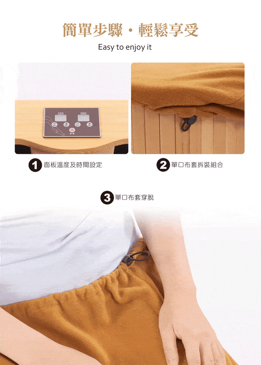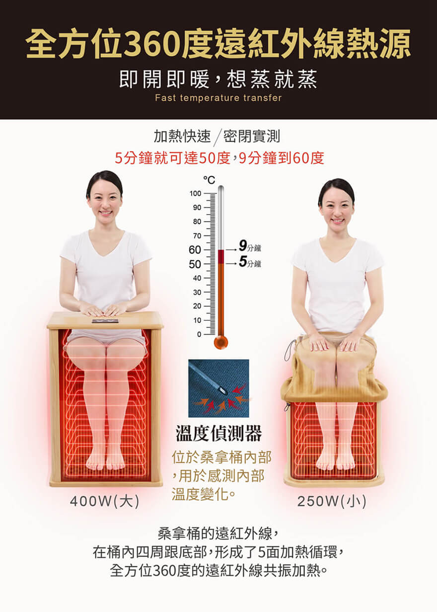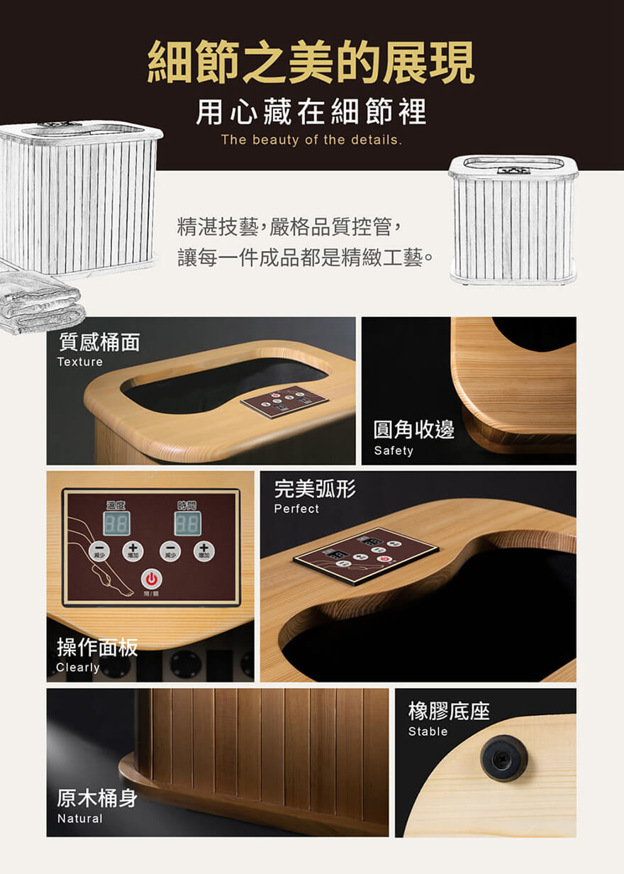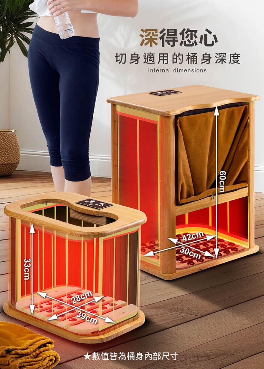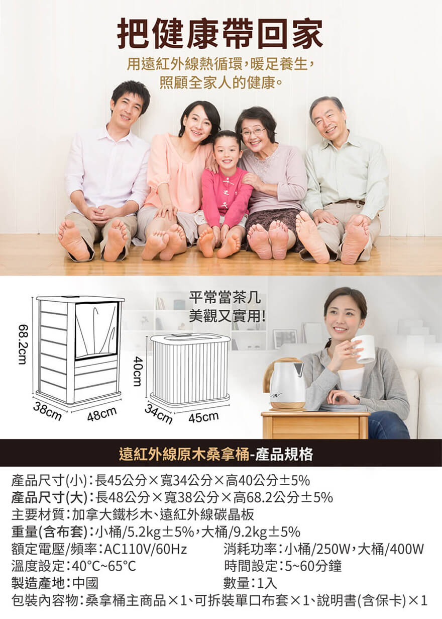 產品名稱:【MOLIJIA 魔力家】知足常熱-遠紅外線原木桑拿桶-輕巧版小型顏色:原木產品尺寸:桶身:長45cm x 寬34cm x 高40cm ±5%可拆裝加長型布套:長59cm x 寬69cm±5%電源線:250cm±5%整機重量:5.2 Kg±5% (含可拆裝加長型布套)主要材質:加拿大鐵杉木+遠紅外線碳晶板使用電壓:AC 110V /60HZ消耗功率:250W商檢字號:R53615製造產地:中國 (台灣設計)包裝內容物:桑拿桶主商品x1 +可拆裝單口布套x1+說明書(含保卡)x1※ 於購買日期(或製造日期)起算保固內,非人為不當使用的新品故障瑕疵維修,由本公司派車【免費到府收送】維修,所產生的費用由本公司全額負擔。(限台灣本島內收送)※ 產品在正常使用範圍內,享有自購買日期(或製造日期)起算24個月內,產品零件免費維修更換的保固服務。符合有下列所述時,請勿使用或是在專業醫師指導下使用:1、孕婦。2、使用中有胸悶、呼吸不順或其他不適症狀時,請立即停止使用。3、飯後30分鐘內。4、重傷初癒或剛開完刀,身體尚未復元。※ 請保持產品本體的乾燥,請勿在浴室或潮濕處使用;本產品請勿使用在頭部和傷口處。※ 鑑賞期內如需退換貨,商品本身、贈品、包裝彩盒均務必保持完整齊 。