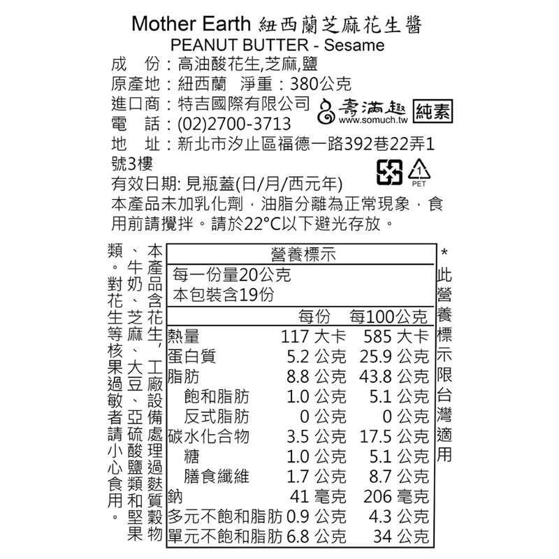 #紐西蘭#芝麻醬#抹醬#高油酸#涼拌#全素👉 全新包裝,全新式樣,新鮮上架✔採用紐西蘭高油酸花生, 不易變質 不加糖, 無多餘熱量, 只用些許鹽巴帶出花生的香甜 ~✔紐西蘭生產製造, 原裝進口來台, 鄉民熱搜最愛花生醬之一 !✔高油酸花生和白芝麻搭配一起享用,白芝麻的鋅、鎂含量較黑芝麻高,(鋅有助於維持成長發育與生殖機能,增進皮膚健康,鎂有助於骨骼與牙齒正常發育及神經正常功能)✔Mother Earth訴求天然, 產品皆極簡單純粹, 源自「大地母愛」👉芝麻花生醬成分:花生,芝麻,鹽• 內容規格 : 380g/瓶• 保存期限 : 1年• 有效日期 : 如包裝上所示• 原產地(國) : 紐西蘭■ 代理商: 好健康國際有限公司■ 代理商電話: 02-26755234■ 代理商地址: 新北市樹林區千歲街57-7號■ 投保產品責任險字號 : 1504 字第 11PD02948 號■ 食品業者登錄字號 : H-153997270-00000-7• 食用方式 : 可塗抹在吐司或依個人喜好食用• 注意事項 : 本產品含有花生, 不適合對其過敏體質者食用 • 保存方式 : 置於陰涼乾燥處, 22度以下避免陽光直射, 開封後請儘早食用, 以 免影響風味