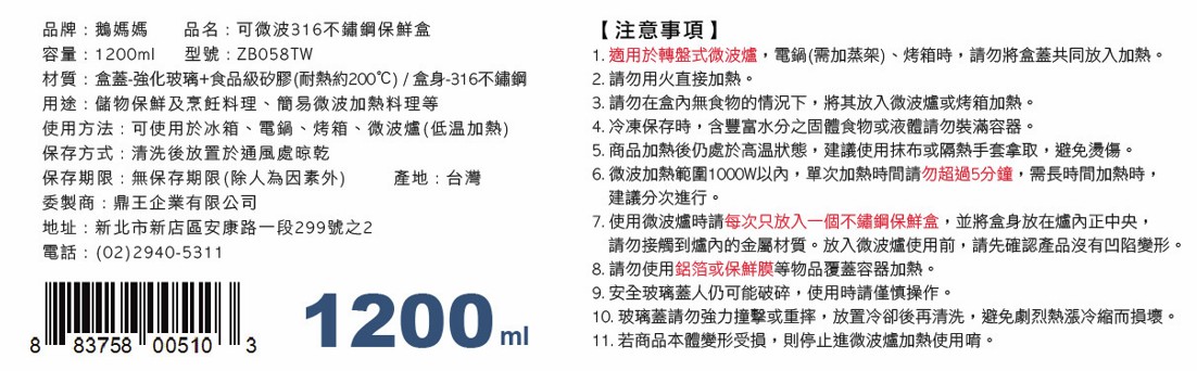 MotherGoose 鵝媽媽 醫療級316不鏽鋼可微波保鮮盒1200ml