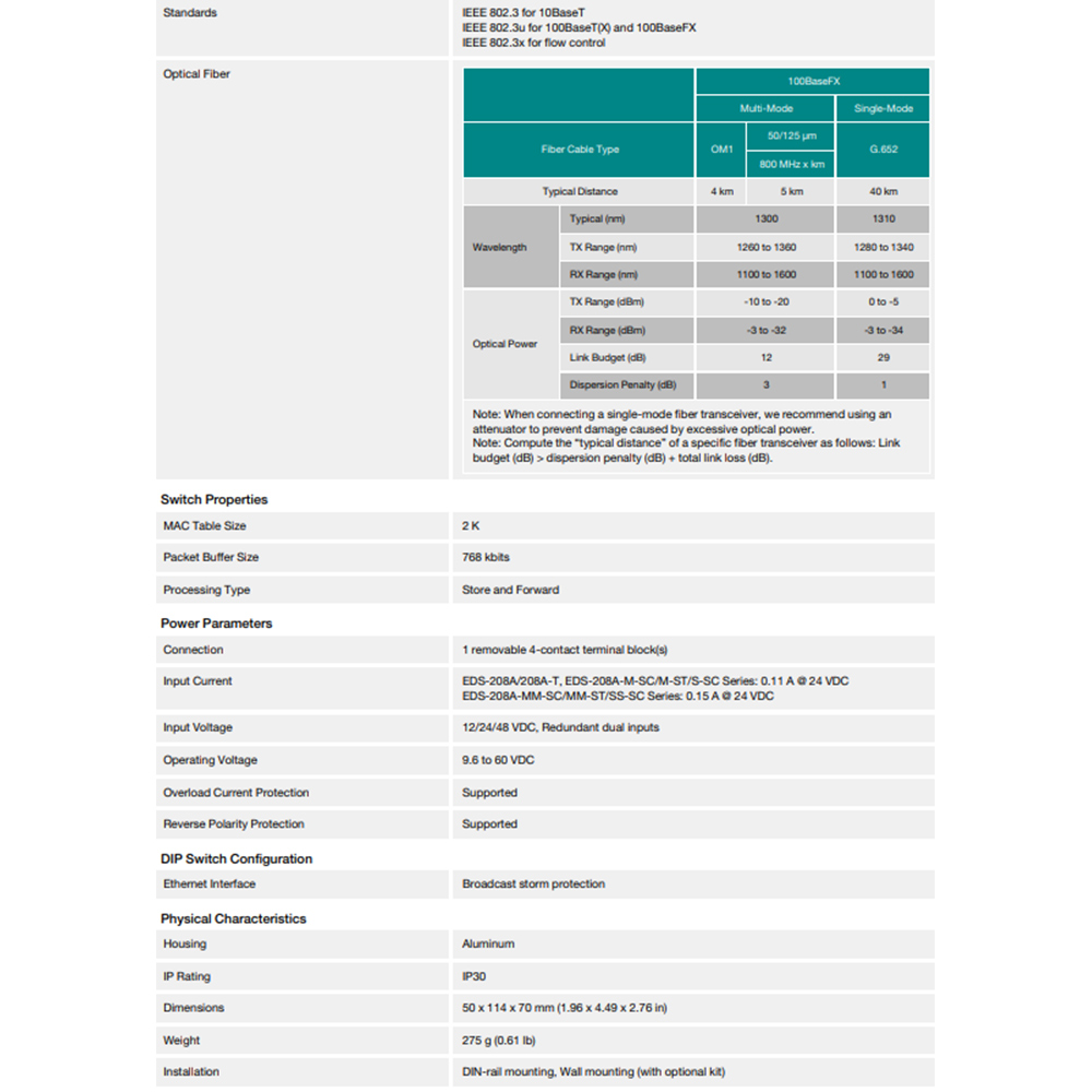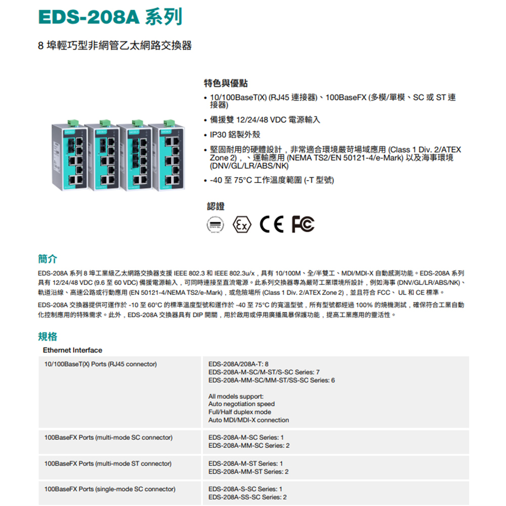 -10/100BaseT(X) (RJ45連接器)、100BaseFX (多模/單模、SC或ST連接器) 。