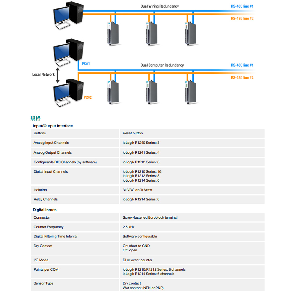-內建訊號中繼器的雙RS-485遠端 I/O。