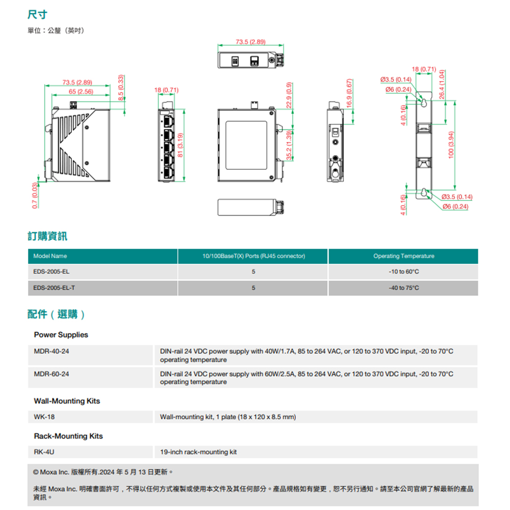 EDS-2005-EL系列具有12/24/48 VDC單電源輸入、DIN Rail鋁軌安裝軌,以及高等級EMI/EMC防護能力。除了小巧的尺寸之外,EDS-2005-EL系列也通過 100%的高溫測試,確保在布署後能夠穩定運作。EDS-2005-EL系列具有-10至60°C的標準操作溫度範圍,同時具有寬溫度型號可選(-40至75°C)。