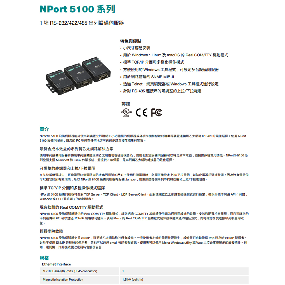 昌運監視器 MOXA NPort 5110 1埠RS-232串列設備伺服器