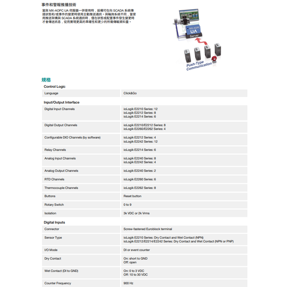 Moxa ioLogik E2200系列乙太網路遠端I/O是一款基於PC的資料擷取和控制設備,使用基於事件的主動報告來控制I/O設備,並具有Click&Go程式介面。不同於被動且必須輪詢資料的傳統型PLC,Moxa ioLogik E2200系列在與我們的 MX-AOPC UA伺服器配對時,將僅在狀態變更或配置事件發生時才會向伺服器主動推播訊息與SCADA系統進行通訊。此外,ioLogik E2200還具有使用NMS(網路管理系統)進行通訊和控制的SNMP功能,可讓IT專業人員根據配置規格所推送的I/O狀態報告來配置設備。對於基於PC的監控來說,這種異常報告方法是一種全新方法,與傳統輪詢方式相比,所需頻寬要少得多。