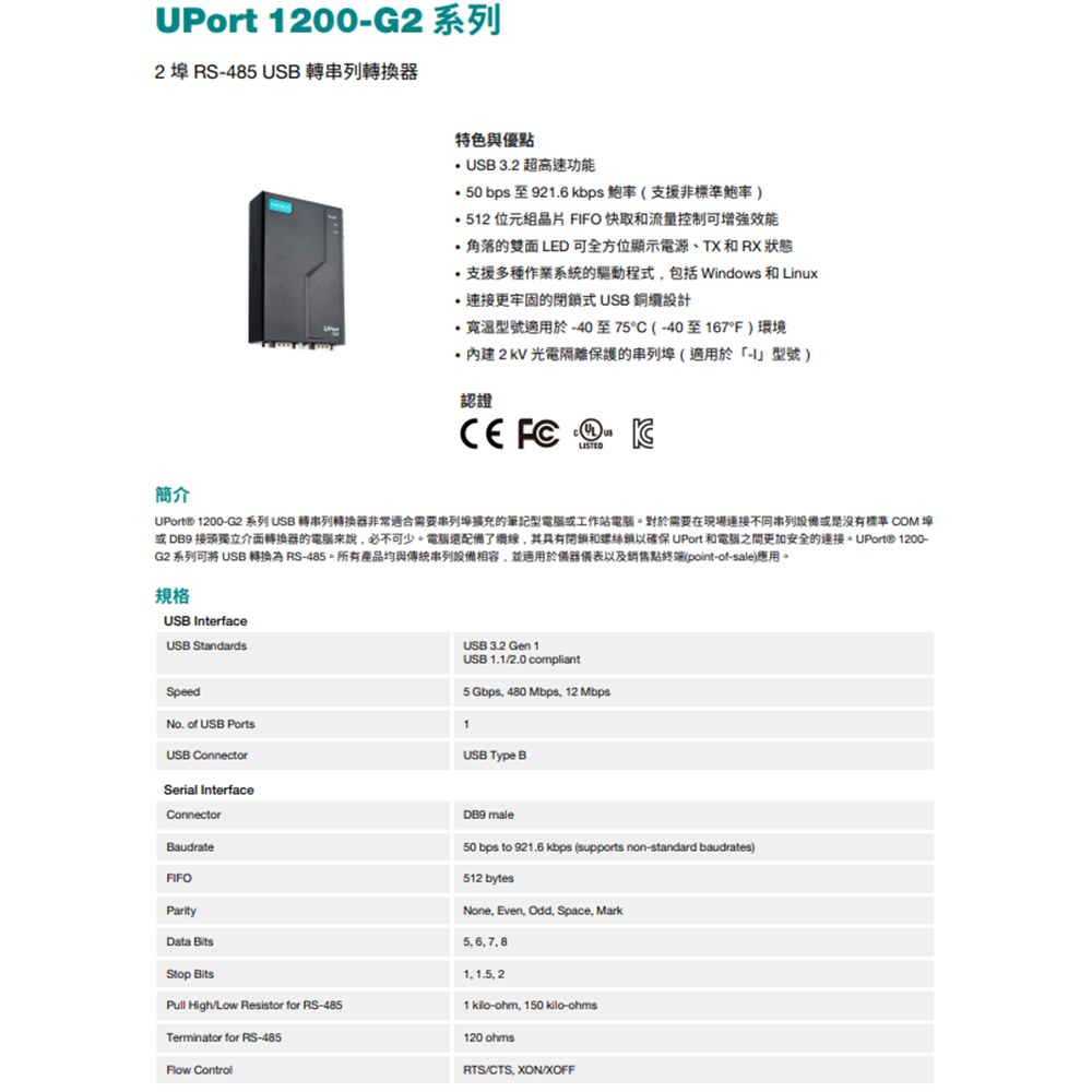 UPort 1200-G2系列USB轉串列轉換器非常適合需要串列埠擴充的筆記型電腦或工作站電腦。對於需要在現場連接不同串列設備或是沒有標準COM埠或DB9接頭獨立介面轉換器的電腦來說,必不可少。電腦還配備了纜線,其具有閉鎖和螺絲鎖以確保UPort和電腦之間更加安全的連接。UPort 1200-G2系列可將USB轉換為RS-485。所有產品均與傳統串列設備相容,並適用於儀器儀表以及銷售點終端(point-of-sale)應用。
