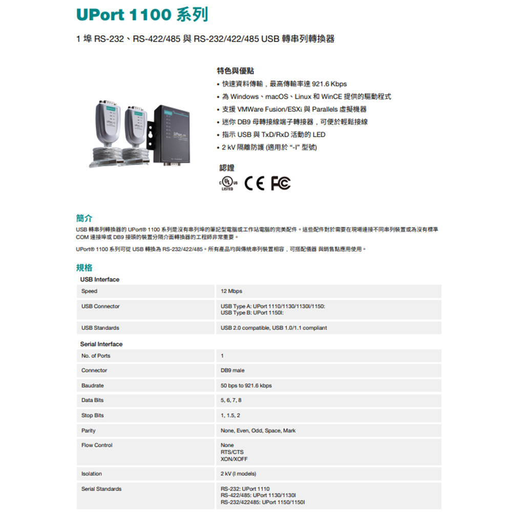 UPort 1100系列可從USB轉換為RS-232/422/485。所有產品均與傳統串列裝置相容,可搭配儀器與銷售點應用使用。