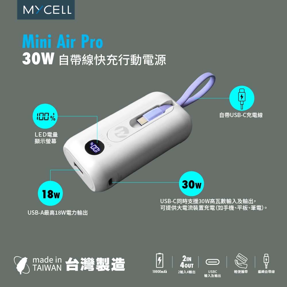 【山水之寶】Mini Air Pro PD30W 自帶雙線快充行動電源 10000mAh MIT 台灣製造 防爆電芯 白色