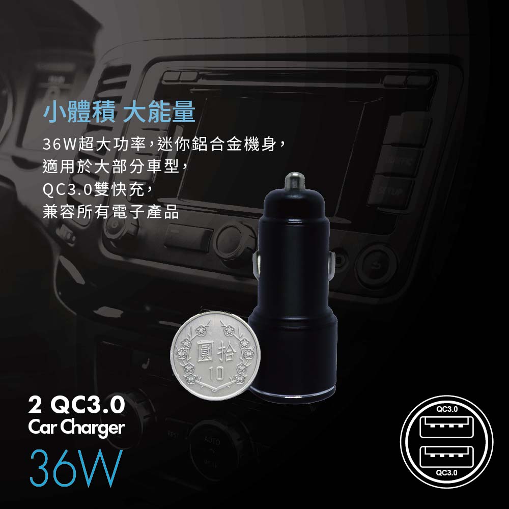 • 適用車型:大多數主流車型【商品規格】•額定輸入 : DC12-24V 3.5A•額定輸出USB-A1 :DC5V 3A/DC9V 2A/DC12V 1.5A•額定輸出USB-A2 :DC5V 3A/DC9V 2A/DC12V 1.5A•額定最大總輸出 : 36W•重量 : 30g•尺寸 : 6.5 x 2.7cm