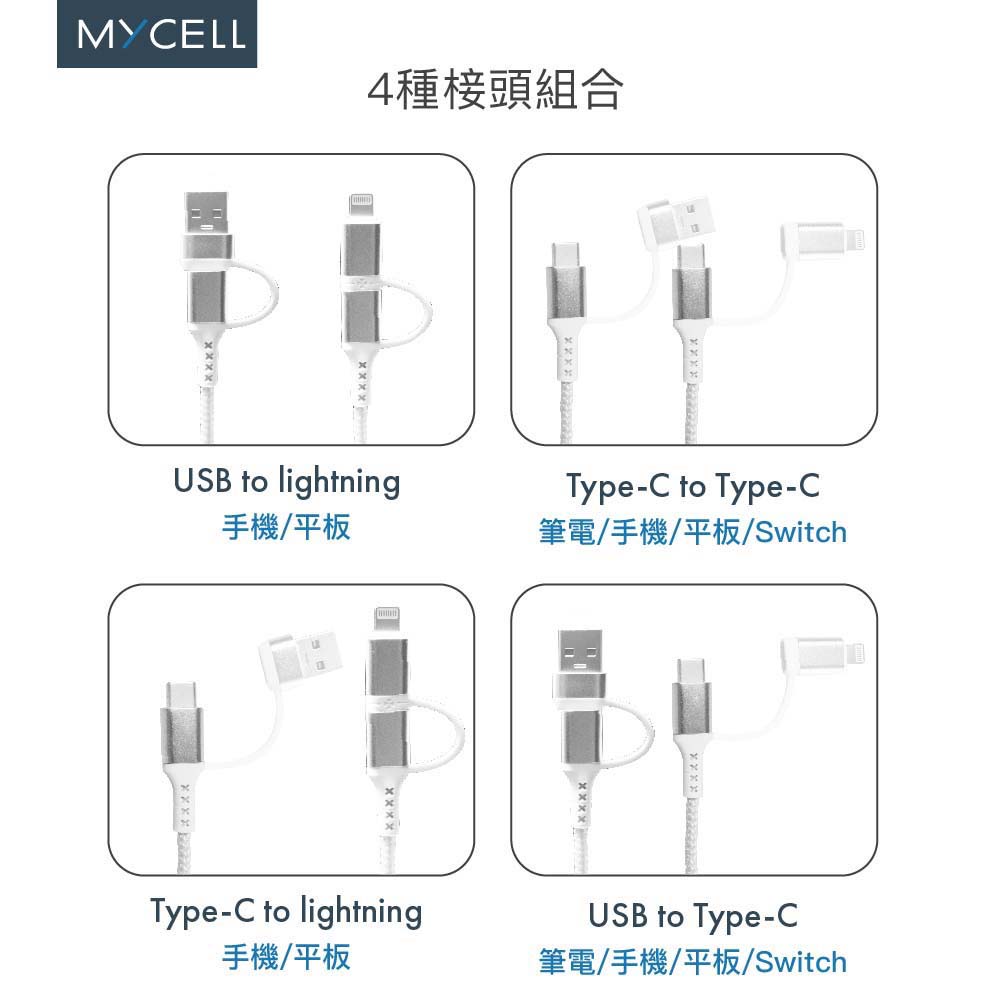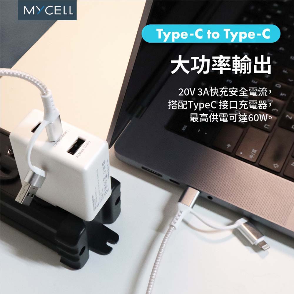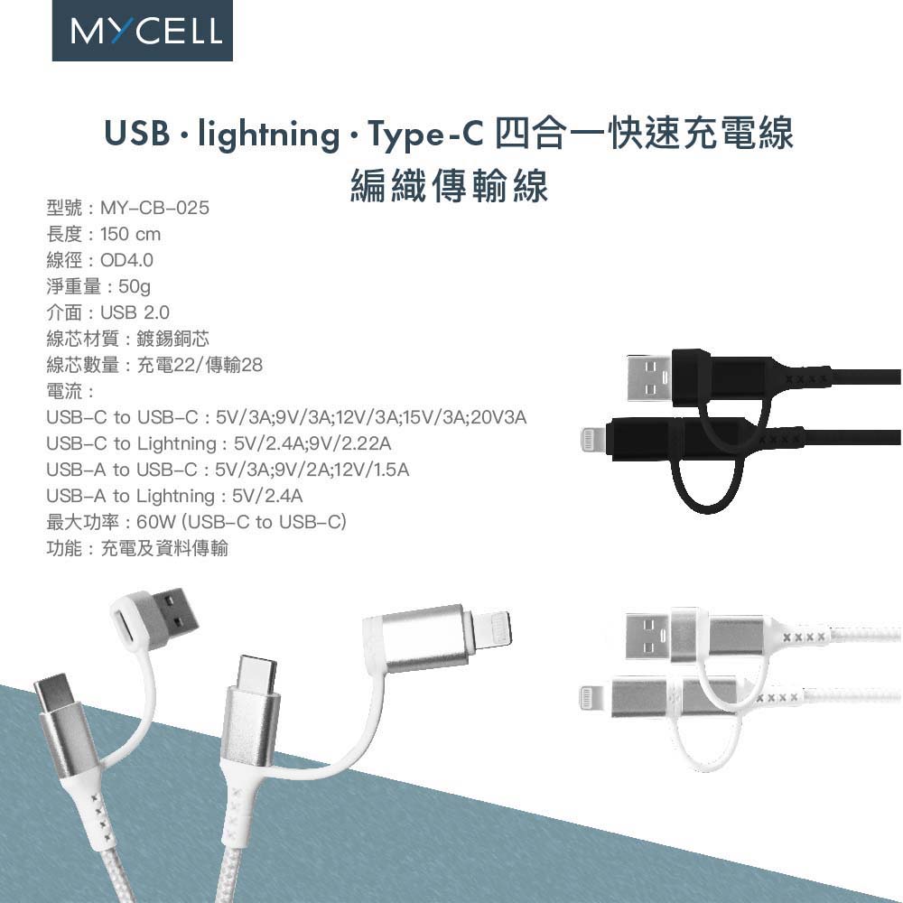 •長度 : 150 cm•線徑 : OD4.0•淨重量 : 50g•介面 : USB 2.0•線芯材質 : 鍍錫銅芯•線芯數量 : 充電22/傳輸28•電流 :USB-C to USB-C : 5V/3A;9V/3A;12V/3A;15V/3A;20V3AUSB-C to Lightning : 5V/2.4A;9V/2.22AUSB-A to USB-C : 5V/3A;9V/2A;12V/1.5AUSB-A to Lightning : 5V/2.4A•最大功率 : 60W (USB-C to USB-C)•功能 : 充電及資料傳輸•型號 : MY-CB-025