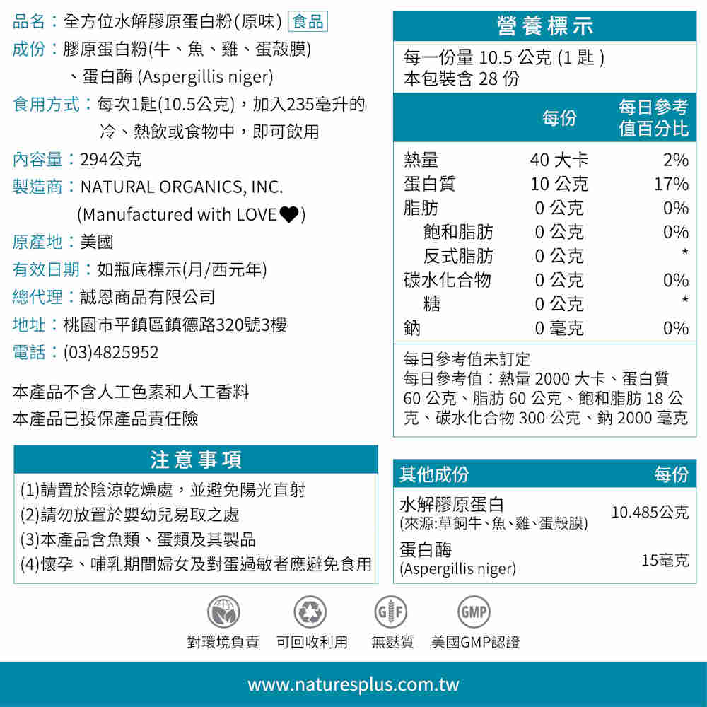 ⭕️病後補養好幫手✅品名:全方位水解膠原蛋白粉(原味)✅內容量:294公克✅有效日期:2028年/11月✅與天然佳的維他命C一起吃,增加膠原蛋白吸收率。✅水解膠原蛋白好處,可以GOOGLE就可以了解唷~~Q&AQ:請問全方位水解膠原蛋白膠囊的成份與全方位水解膠原蛋白膠粉的成份有什麼不同?A:膠囊營養標示原廠沒有宣稱含16種胺基酸,粉狀的有含16種胺基酸。♻️環保輕簡包裝,愛護地球,無法接受請不要下單唷!♻️購買公司貨,隨貨附發票;買的放心,食在安心。【NaturesPlus 天然佳】 台灣總代理 SINCE 1972