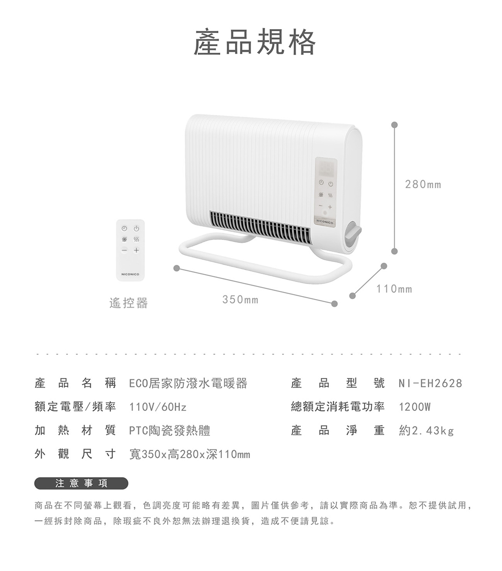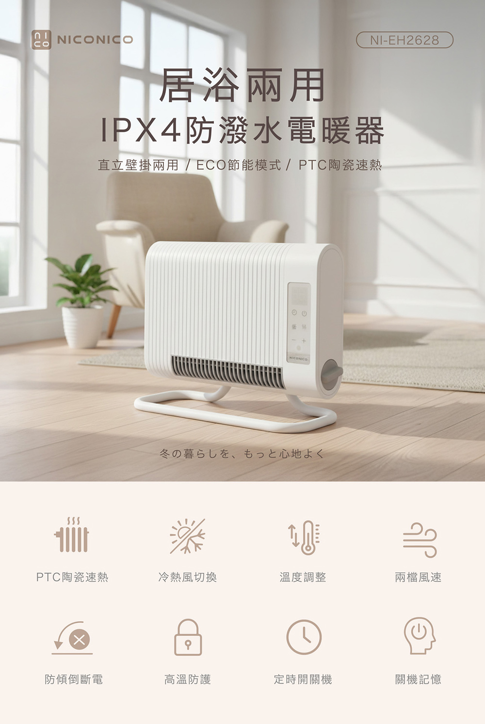 【NICONICO】ECO居浴兩用防潑水電暖器NI-EH2628