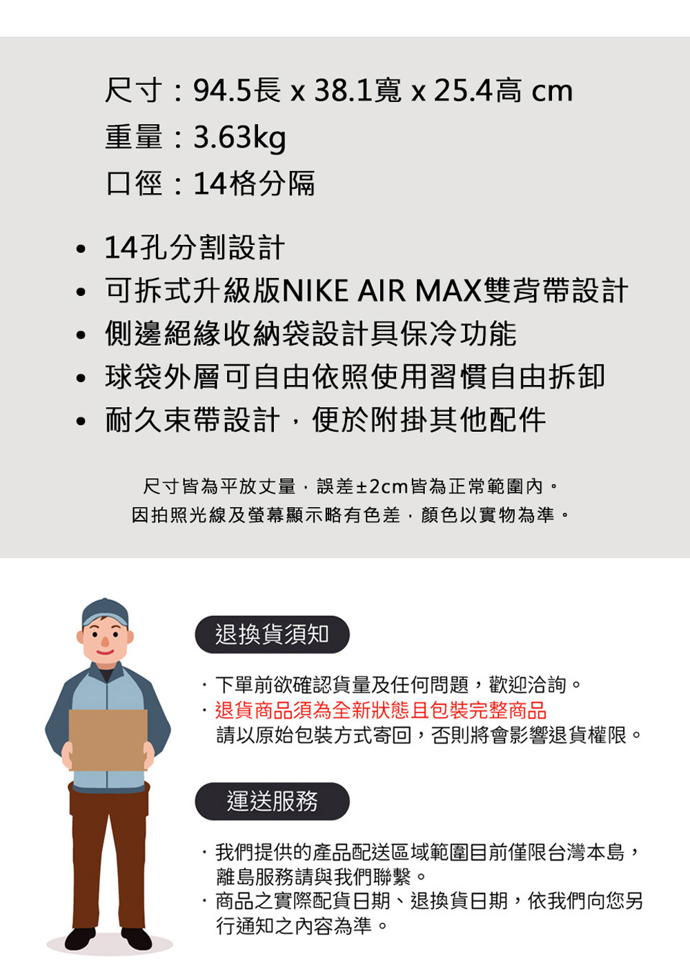 產品描述:NIKE AIR HYBRID 2 腳架袋 N1003478091OS黑特色:14孔分割設計。可拆式升級版NIKE AIR MAX雙背帶設計。側邊絕緣收納袋設計具保冷功能,助於食品保鮮。球袋外層可自由依照使用習慣自由拆卸。耐久束帶設計,便於附掛其他配件。口袋數: 7。材質: 100% 聚酯纖維規格: 94.5長x38.1寬x25.4高cm重量: 3.63kg口徑: 14格分隔【注意事項】1.提供15天鑑賞期之權益2.退貨商品須為全新狀態且包裝完整商品,請以原始包裝方式寄回,包含完整無損之外箱、商品、包裝紙,目錄、吊牌、贈品、配件等,若原外箱已遺失,請另使用紙箱包覆於商品原廠包裝外,切勿直接於原包裝上黏貼紙張或書寫文字,來做寄送,若原盒內所有物品有損壞或遺失,須付整新費。